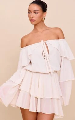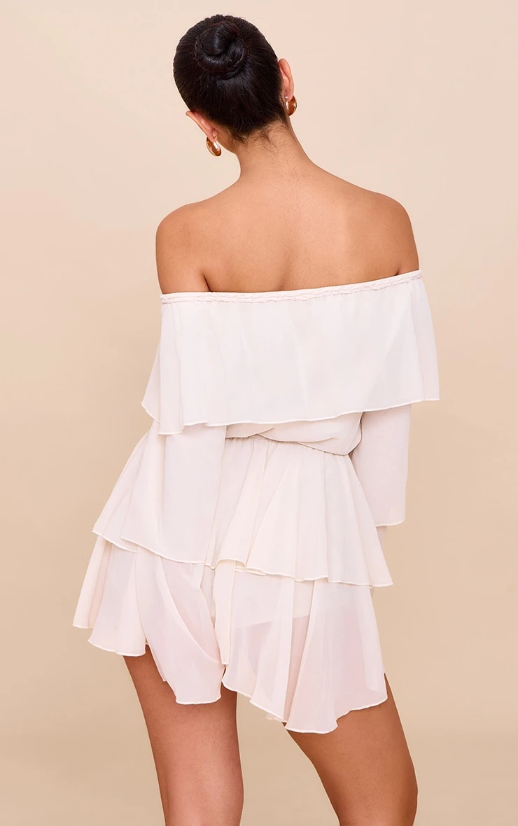 Showcase your boho side with this cream chiffon ruffle detail long sleeve romper. Crafted from pale hue chiffon, this romper has a bardot neckline, feminine ruffling and a tie detail at the bust. Pair it with cowboy boots and oversized gold earrings for the ultimate festival look.