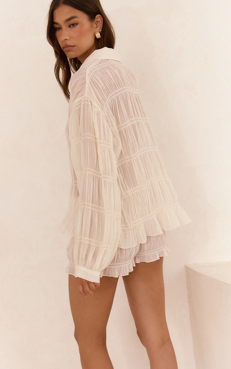 Sweeten up your summer fits with the cream chiffon shirred detail mini shorts. Designed in a lightweight chiffon with flattering shirring and frill hems, they’re your new sunny day staple. Team with a matching chiffon shirt and Slides for an easy two piece set.