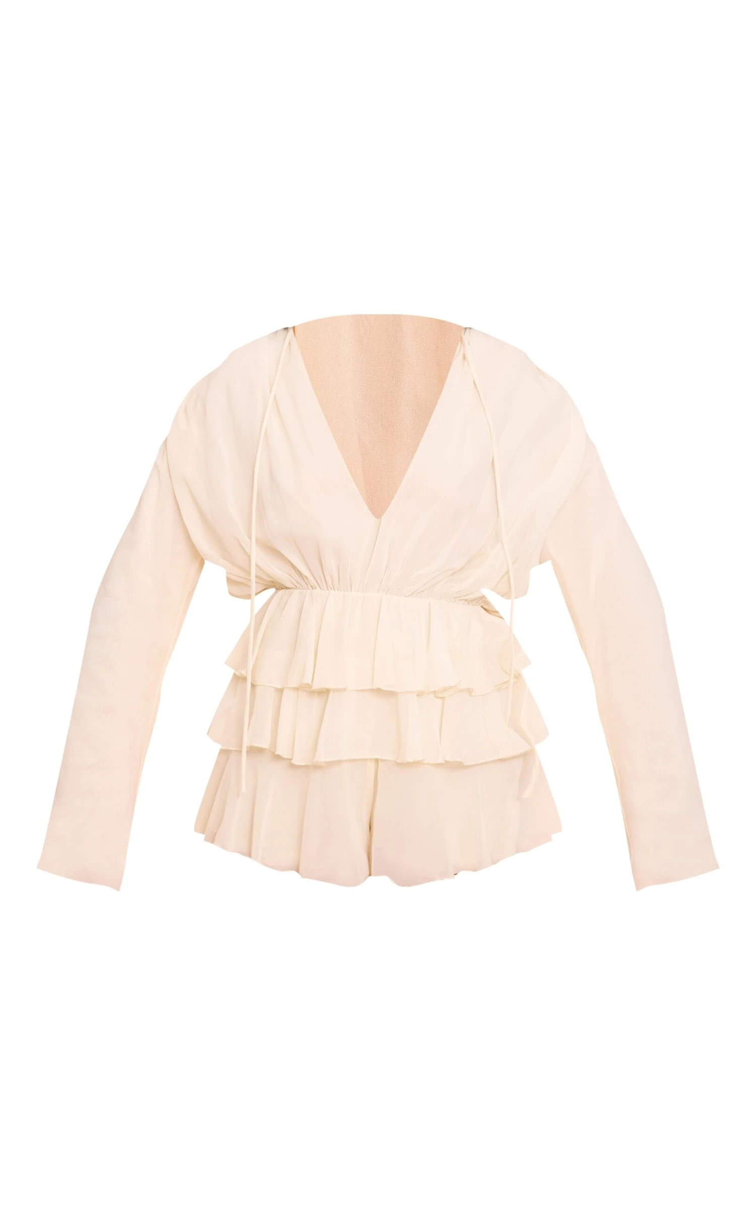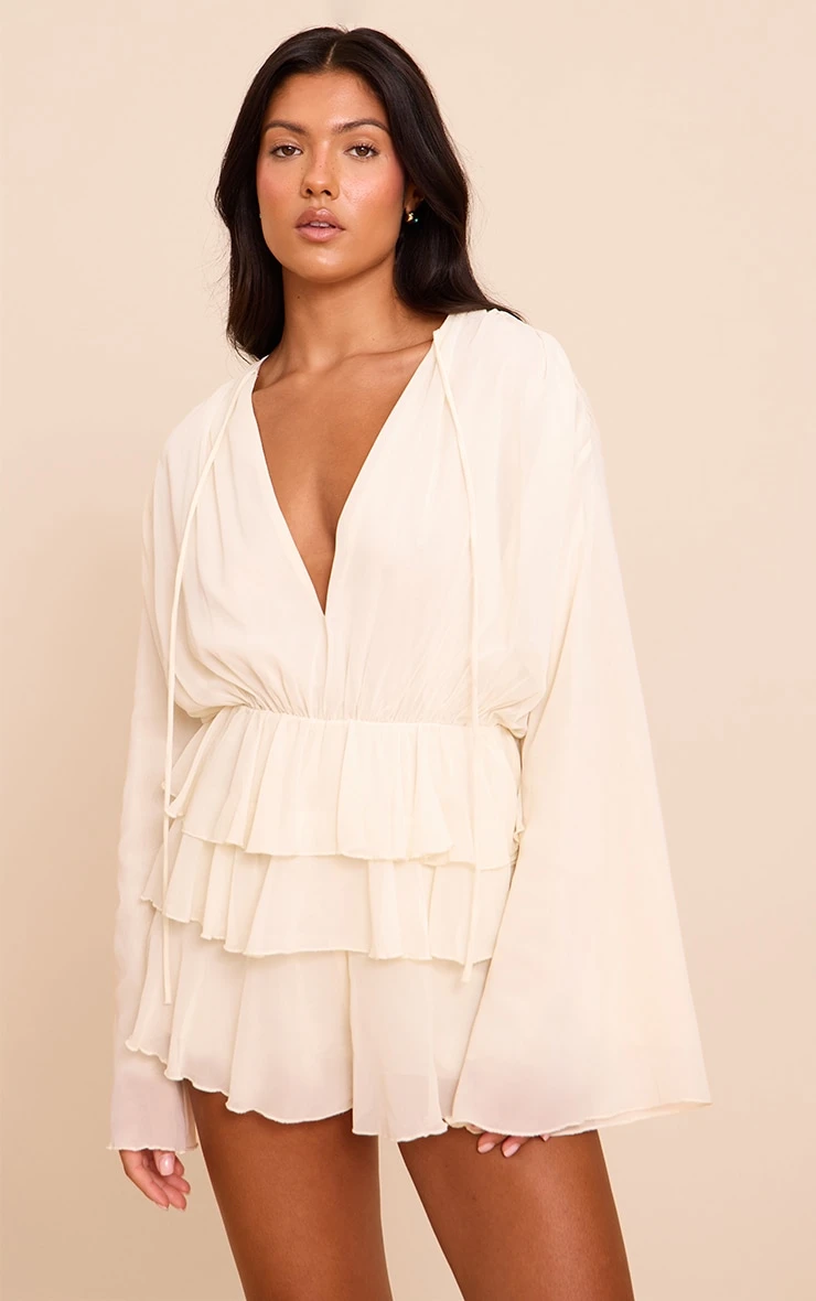 Channel soft femininity in the cream chiffon V neck frill tiered romper. Made from a cream chiffon material, this romper features delicate frills and a flowing tiered shape. Pair with slip-on heels and gold accessories for daytime elegance.