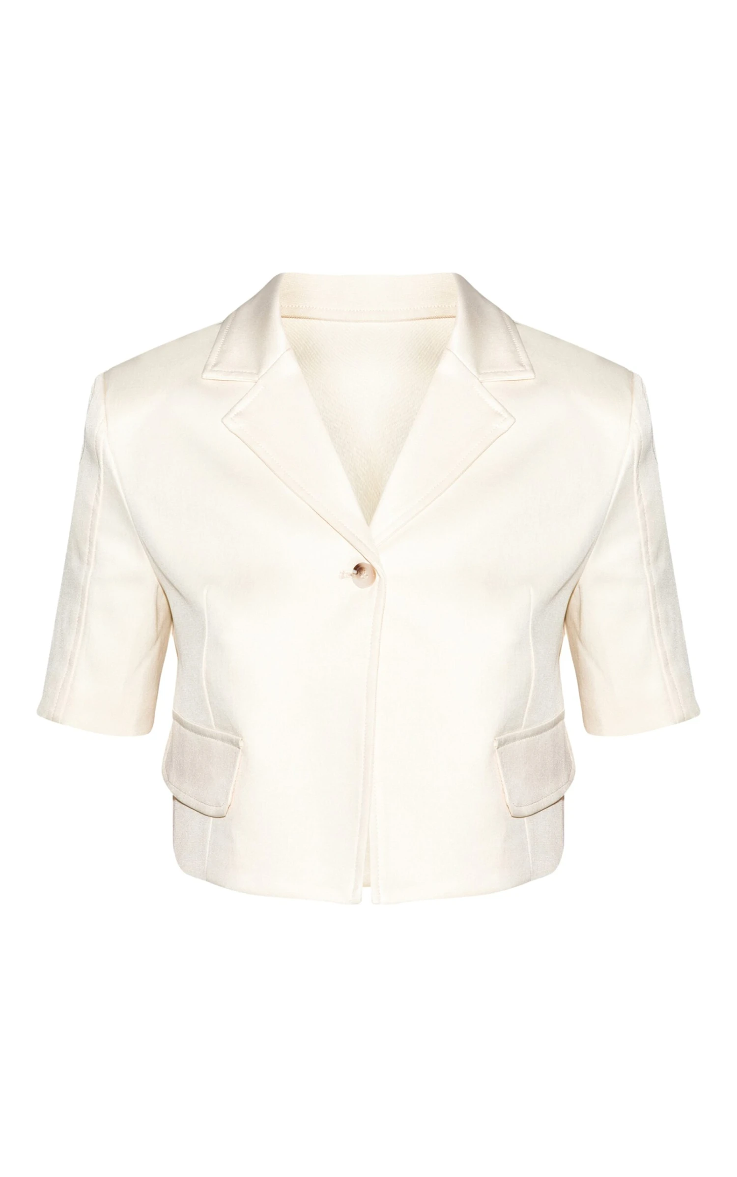 Layer with intention in this cream cropped super boxy blazer, a contemporary twist on classic tailoring. Brought to you in a cream woven fabric with a sharp boxy fit and cropped length, it adds polish to any look. Style with high-waisted pants or a matching mini for tonal perfection.