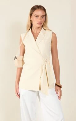 Add a chic touch to your look with this cream tie waist vest. Crafted from a cream linen look material with a tie waist for a flattering fit, it’s ideal for layering with pants or skirts. Team with some wide leg pants and a pair of heels to finish the look.