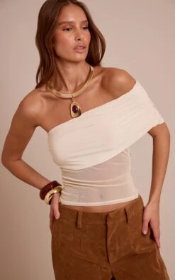 Step into elevated style with the cream mesh panel detail asymmetric long top. Designed in cream mesh with asymmetric panelling, this longline style makes a sleek statement. Team with wide leg pants and stilettos for an evening-ready fit.