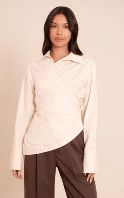 Keep it chic with the cream ruched wrap detail long sleeve shirt. Made from a cream woven material, it features ruched wrap detailing, long sleeves, and a tailored cut. Pair with kitten heels, wide leg pants and gold earrings for a fool proof finish.