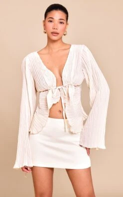 Pleated texture sets the tone for this versatile piece. The Cream Sheer Plisse Tie Front Flute Sleeve Blouse features a sheer finish across its distinctive plisse weave, shaping the form with a plunging V-neckline gathered artfully at a tie front. Long sleeves finish with a pronounced flute at the cuff. Consider this piece with a neutral mini skirt; it’s the effortless style your seasonal wardrobe calls for.