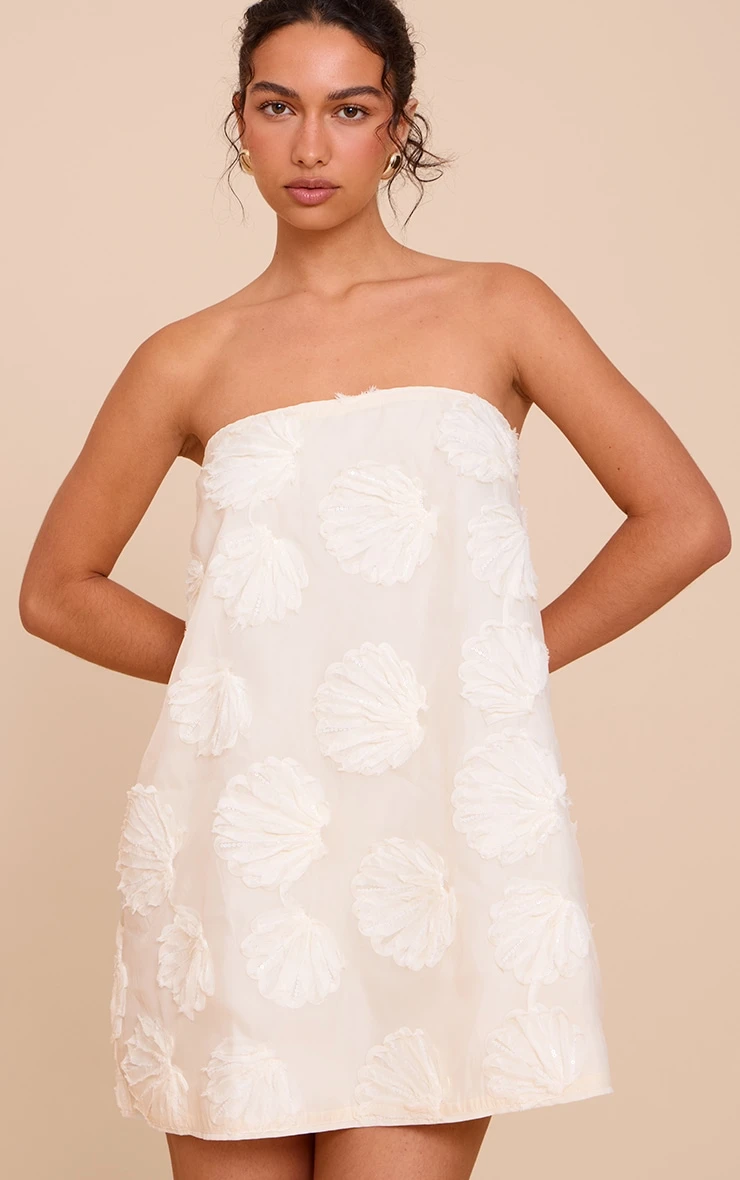 Capture attention with refined ease. This cream shell texture bandeau mini shift dress is your definitive piece for memorable occasion dressing, featuring a clean strapless neckline that perfectly highlights the shoulders. Its distinctive shell applique detail scattered across the cream hue adds a unique, artful dimension to the mini shift silhouette, ensuring an effortless yet confident cut. Pair this standout dress with barely-there heeled mules and a sleek clutch bag to complete a truly sophisticated evening look.