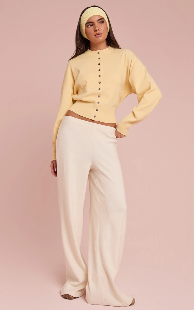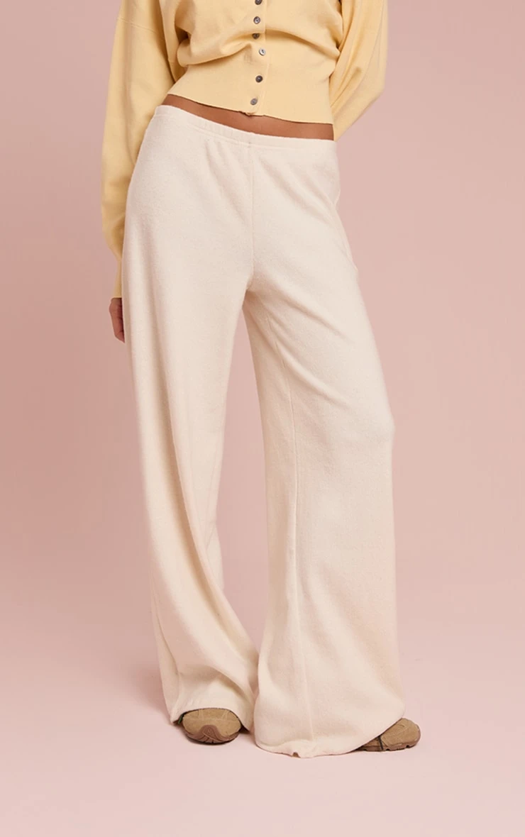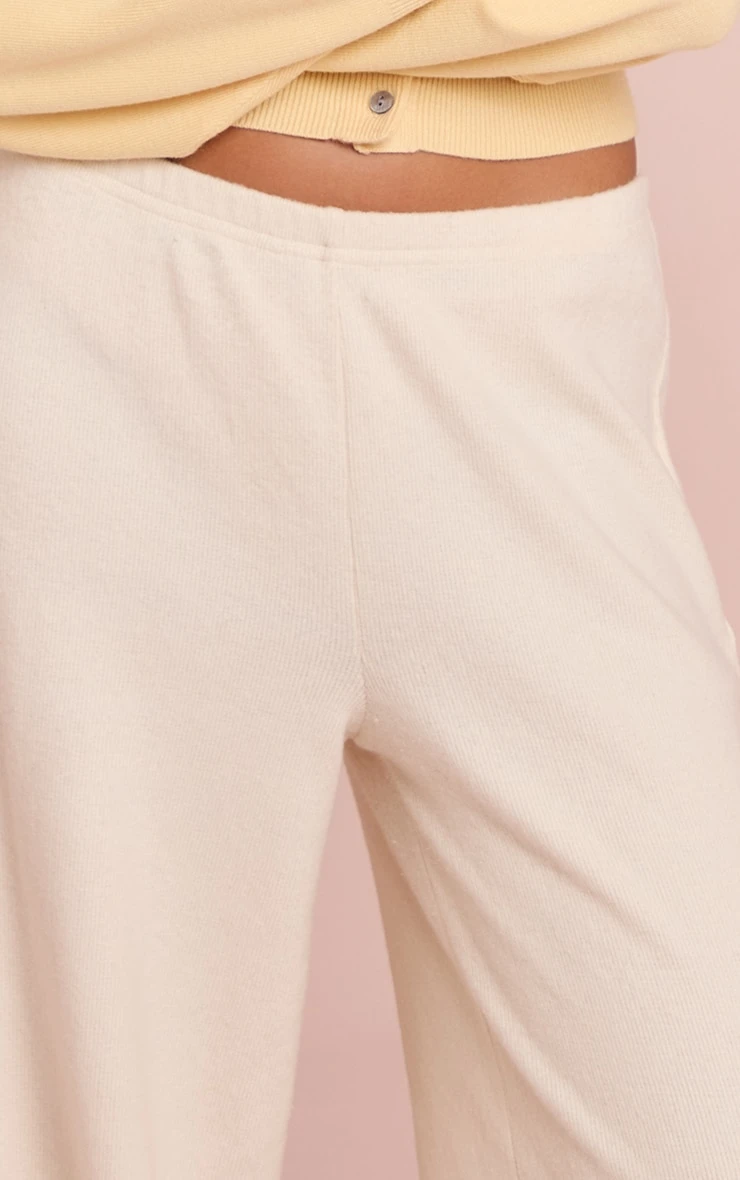 Opt for relaxed sophistication with the cream slouchy thick brushed rib pants. Designed in thick cream rib knit, these pants feature a slouchy wide-leg cut and high-rise fit for comfort. Pair with a cardigan and ballet flats or your favorite sneakers for an elevated lounge look.