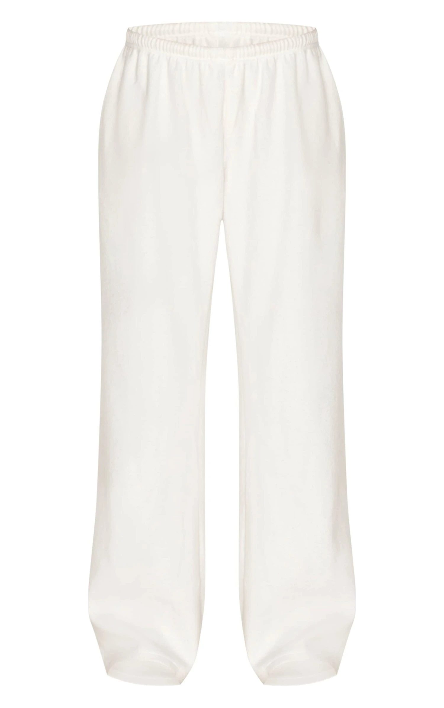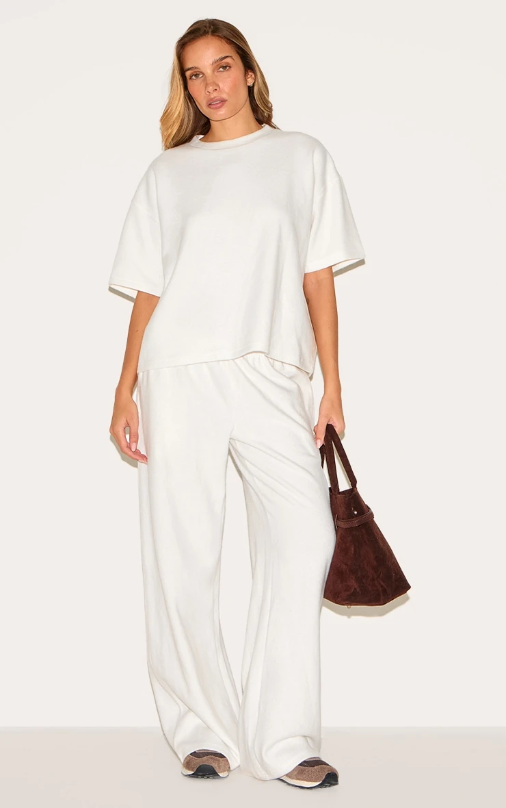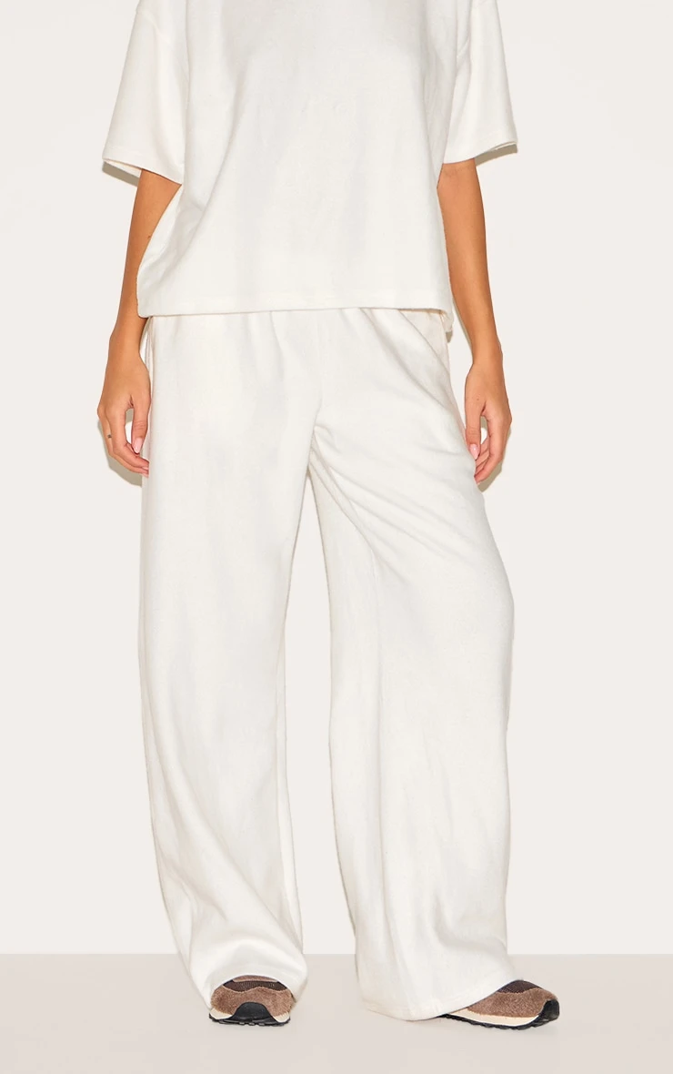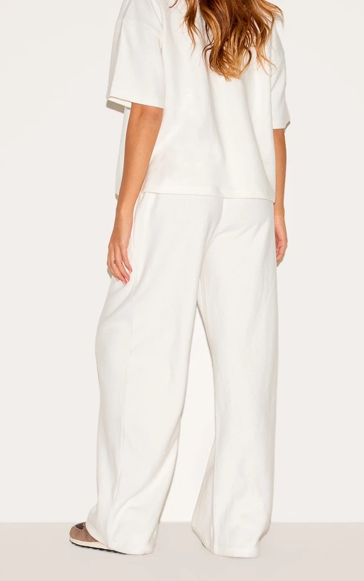Consider these cream wide leg sweatpants your new off-duty essential. Crafted from a supremely soft touch material, the wide leg silhouette offers an elevated take on comfort. The neutral cream hue lends itself to effortless styling; consider pairing with a tonal knit top for a refined lounge look. Finish with chunky sneakers for a contemporary edge that takes you from weekend brunch to city errands with ease.