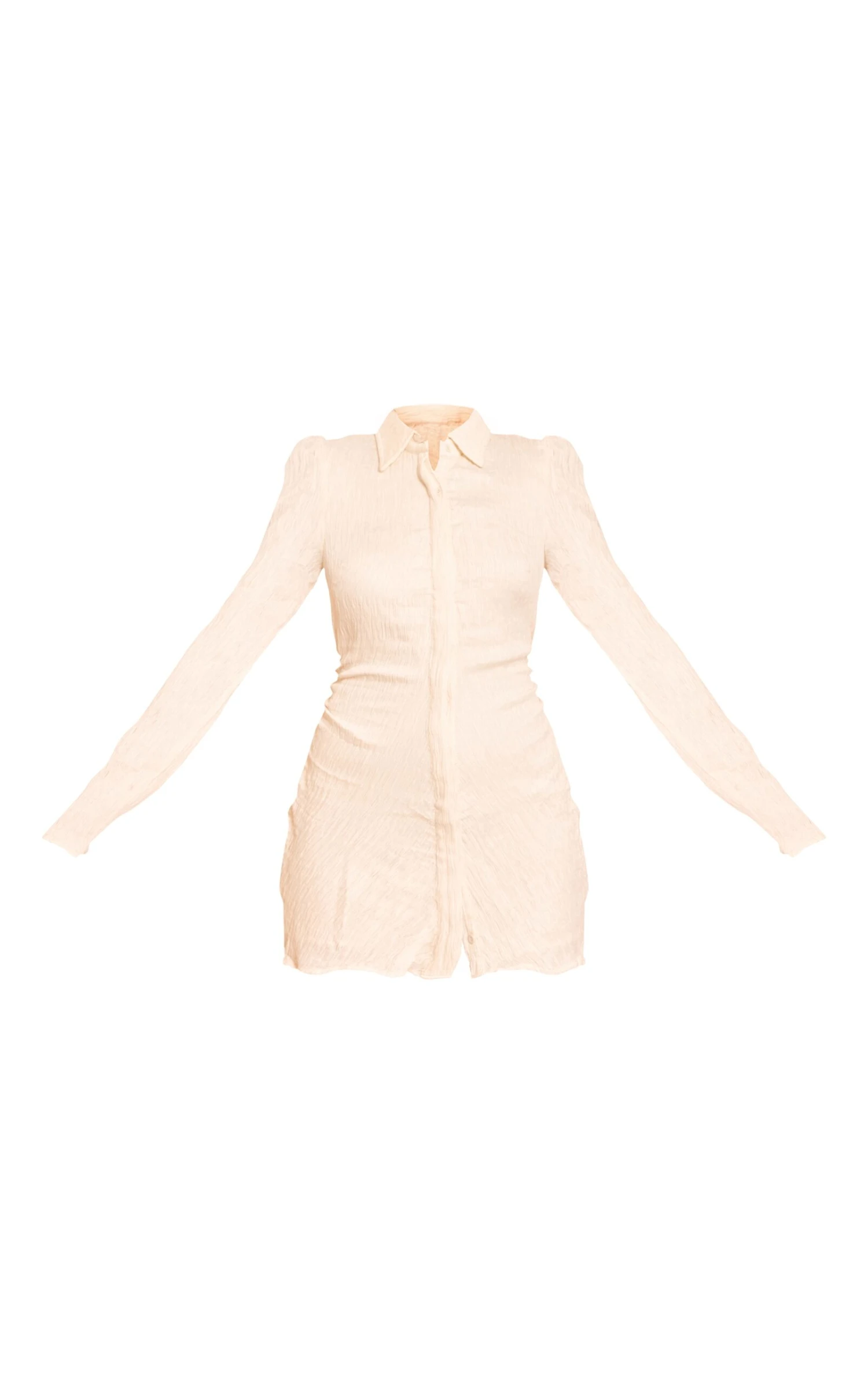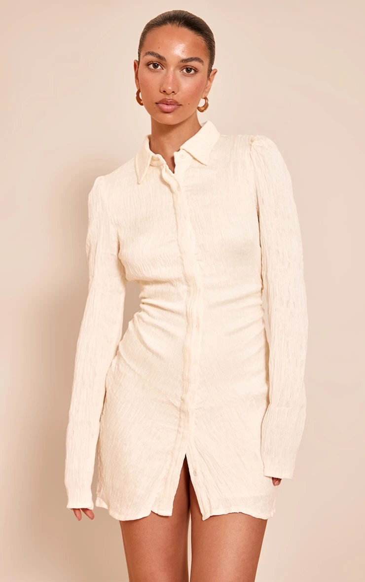Update your shirt dress rotation with the cream textured flute sleeve shirt dress. Featuring textured woven fabric, flute cuffs and a relaxed value-down fit, this piece is equal parts smart and effortless. Wear with slip on sandals or heels and gold accessories for everyday styling with polish.