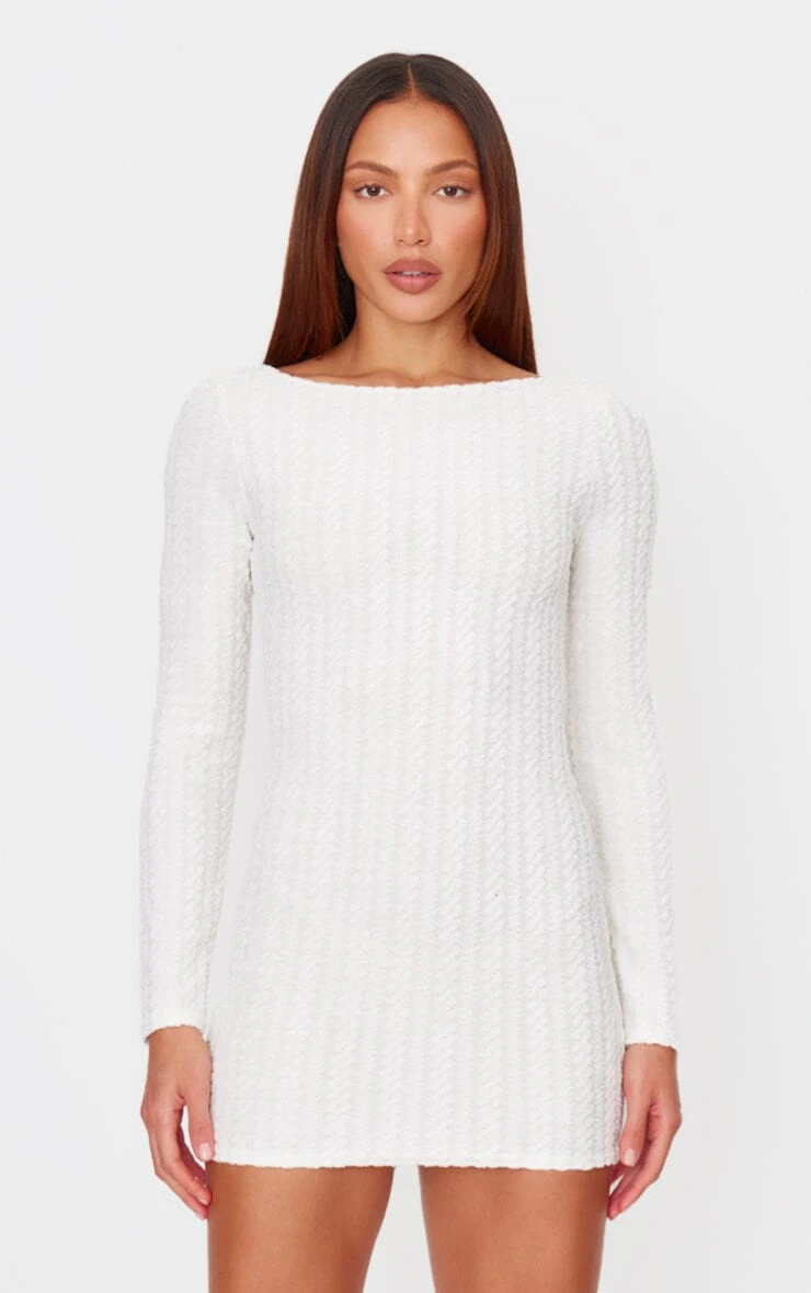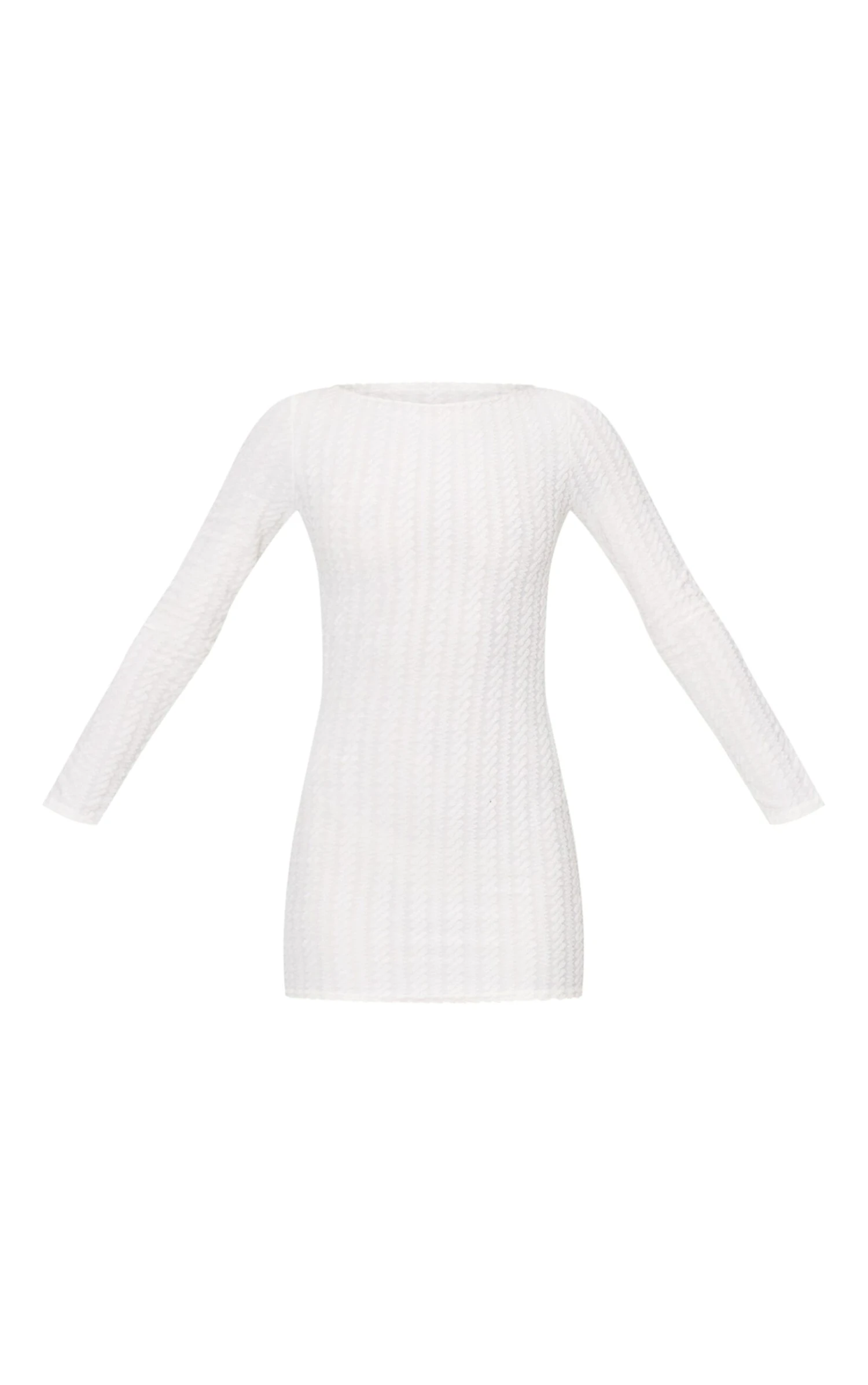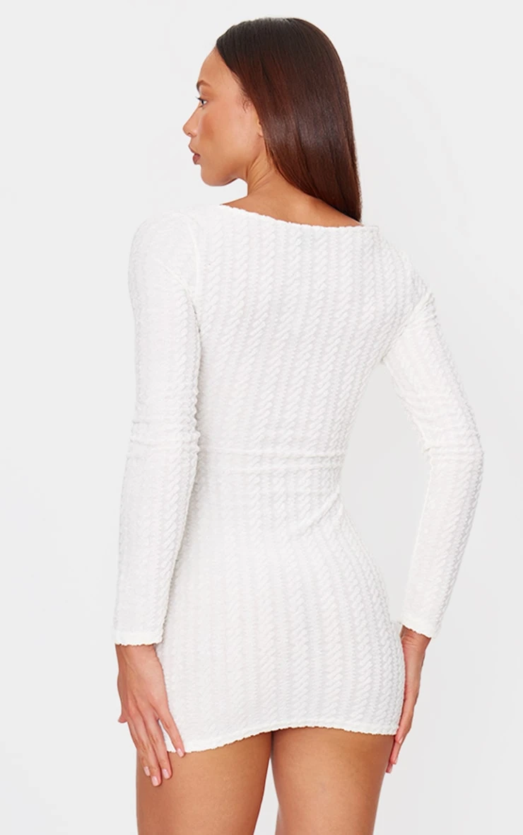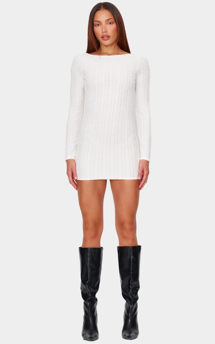 Consider this your style directive: a masterclass in minimalist chic. This cream bodycon dress offers a textural intrigue with its unique towel fabrication. The boat neckline creates an elongated silhouette, ensuring a sophisticated yet subtly daring statement. Elevate the ensemble with a sculptural cuff from our jewelry collection for an effortlessly considered finish.