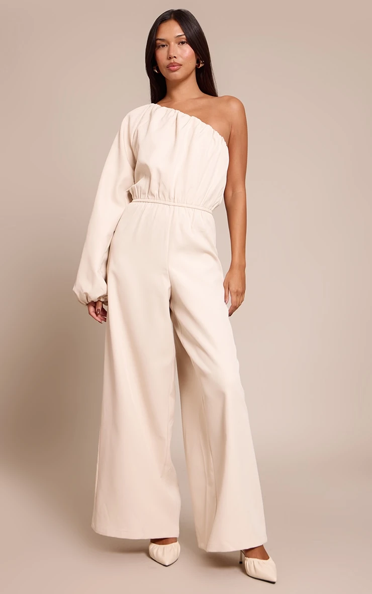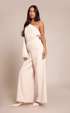 Step into sophistication with the cream woven asymmetric cinched waist jumpsuit. Made from a cream woven material, it features an asymmetric neckline, cinched waist, and wide leg fit for a flattering finish. Style with mid height heels and gold earrings for a fool proof finish.