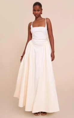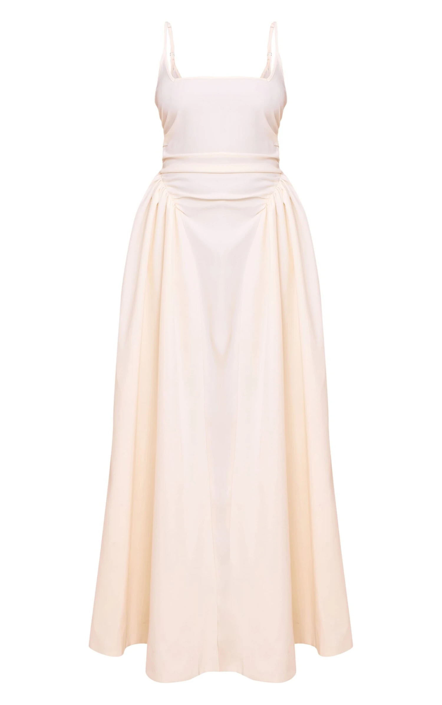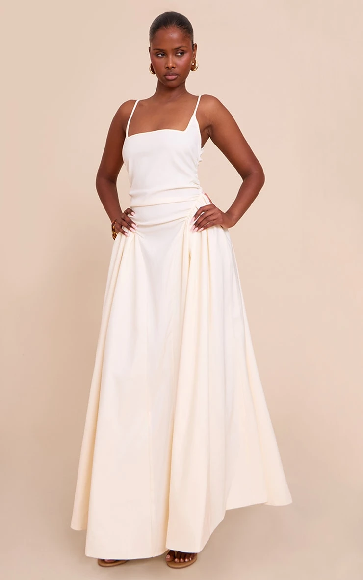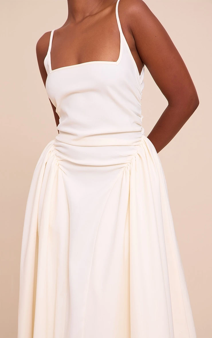 This cream woven ruched strappy midi dress is a summer staple. Brought to you in a cream woven material with a ruched design and a strappy detailing. Team this midi dress with a pair of heels and a statement bag for a look that will get you noticed.