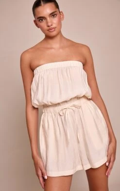 Introducing the cream woven textured bandeau romper. Crafted from cream woven material with a flattering bandeau neckline, tied waist detail and floaty shorts, it’s the perfect throw on piece for this season. For a chic look, pair it with woven ballet flats, an oversized blazer and sunglasses.