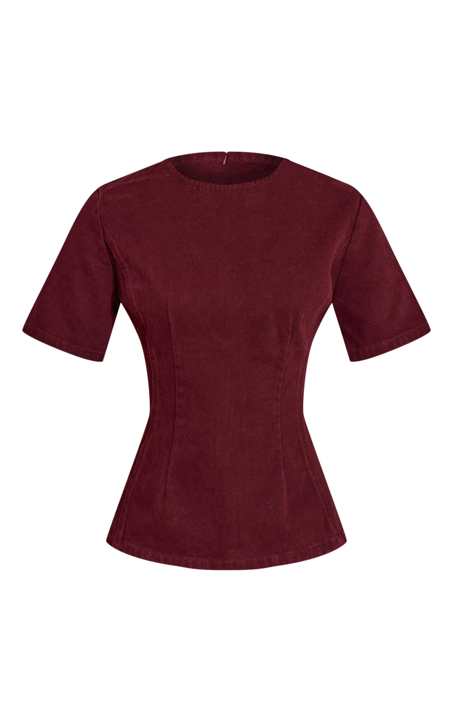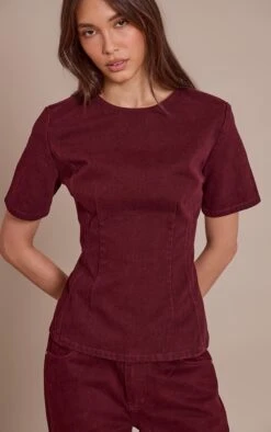 Bring modern denim energy to your wardrobe with the dark burgundy cinched waist peplum denim top. Crafted from structured denim in a deep burgundy hue, this top features a cinched waist and flared peplum hem for a flattering silhouette. Team with matching denim pants for a coordinated statement look.