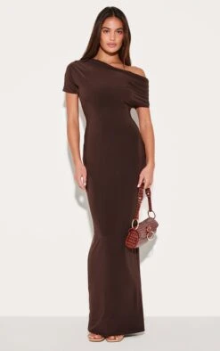 Refine your after-dark repertoire with this dark chocolate maxi dress. Cut from a double-layered slinky fabric that drapes beautifully, the asymmetric silhouette is subtly elevated by a considered ruched sleeve detail. The rich chocolate hue lends itself to understated elegance, perfect for making an impact without uttering a word. Style this piece with a sculptural clutch from our accessories collection for a truly modern take on evening wear.