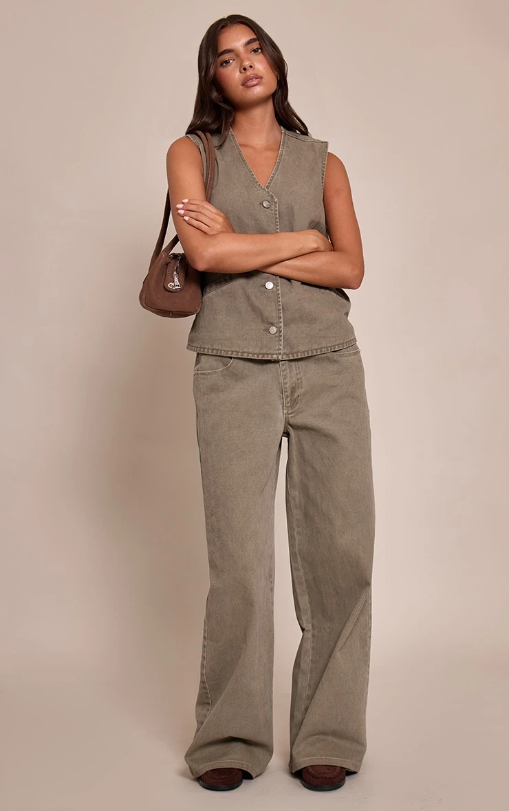 Say hello to the dark khaki sleeveless value down denim vest. Made from dark khaki toned denim, this vest has value fastenings and a classic sleeveless fit. Pair it with the matching pants, brown sneakers and your favorite shoulder bag to take the look to the next level.