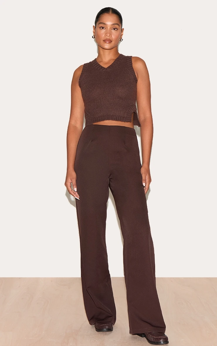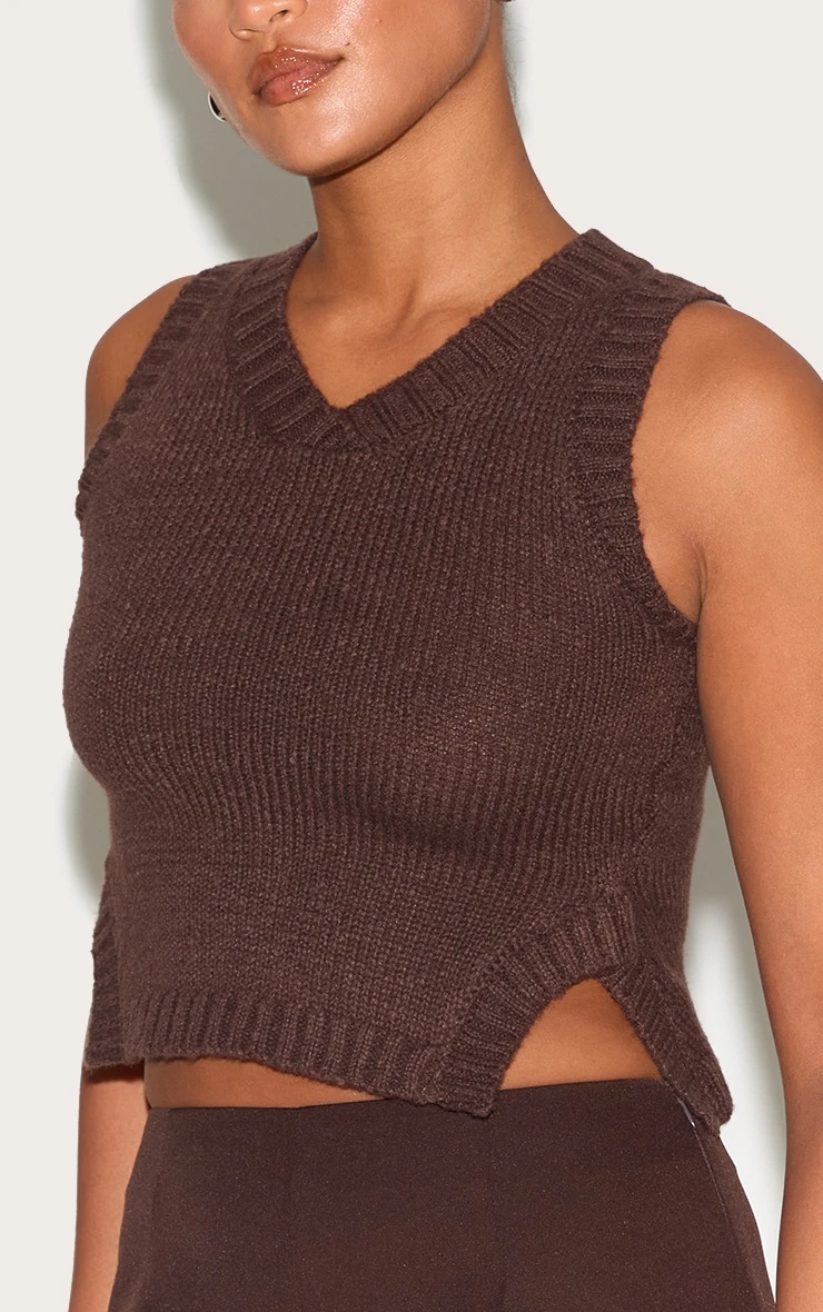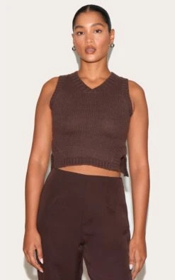 Crafted from a deep chocolate knitted material with a ribbed detail. Style this deep chocolate knitted ribbed detail Vest with the matching tailored pants, a pair of sleek court heels and your go-to accessories to elevate your look even further.