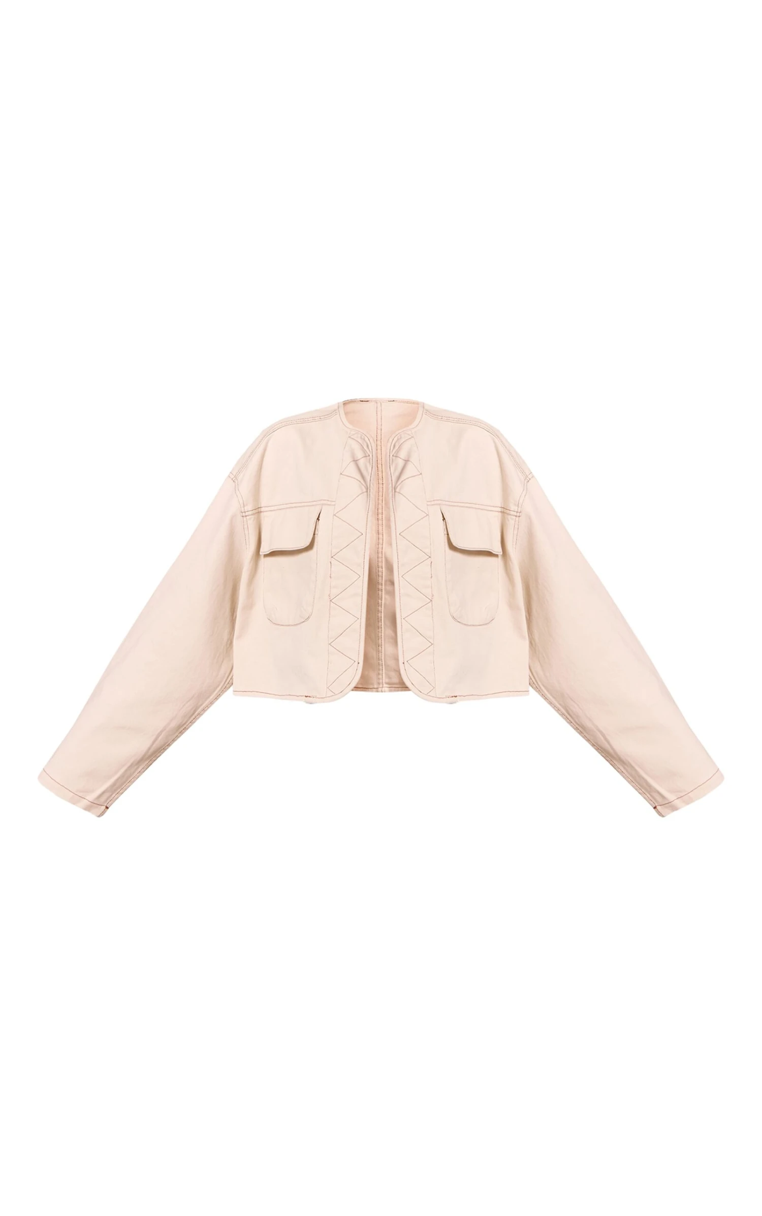 Denim just got an artful update. The ecru curved hem cropped denim jacket leads the way with its distinctive collarless neckline and contemporary curved hem, balanced by wide, relaxed sleeves. Notice the statement contrast topstitching, including a unique zigzag pattern across the front and outlining the chest patch pockets, adding an elevated finish. This piece is perfect for layering; throw it over a ribbed Vest and high-waisted denim jeans, or pair with tailored shorts and chunky sneakers for an assured, off-duty aesthetic. It’s the ultimate addition for an effortlessly cool day look.