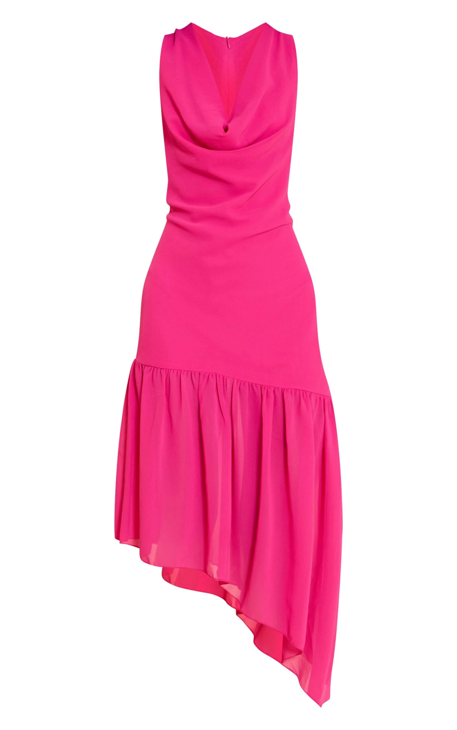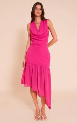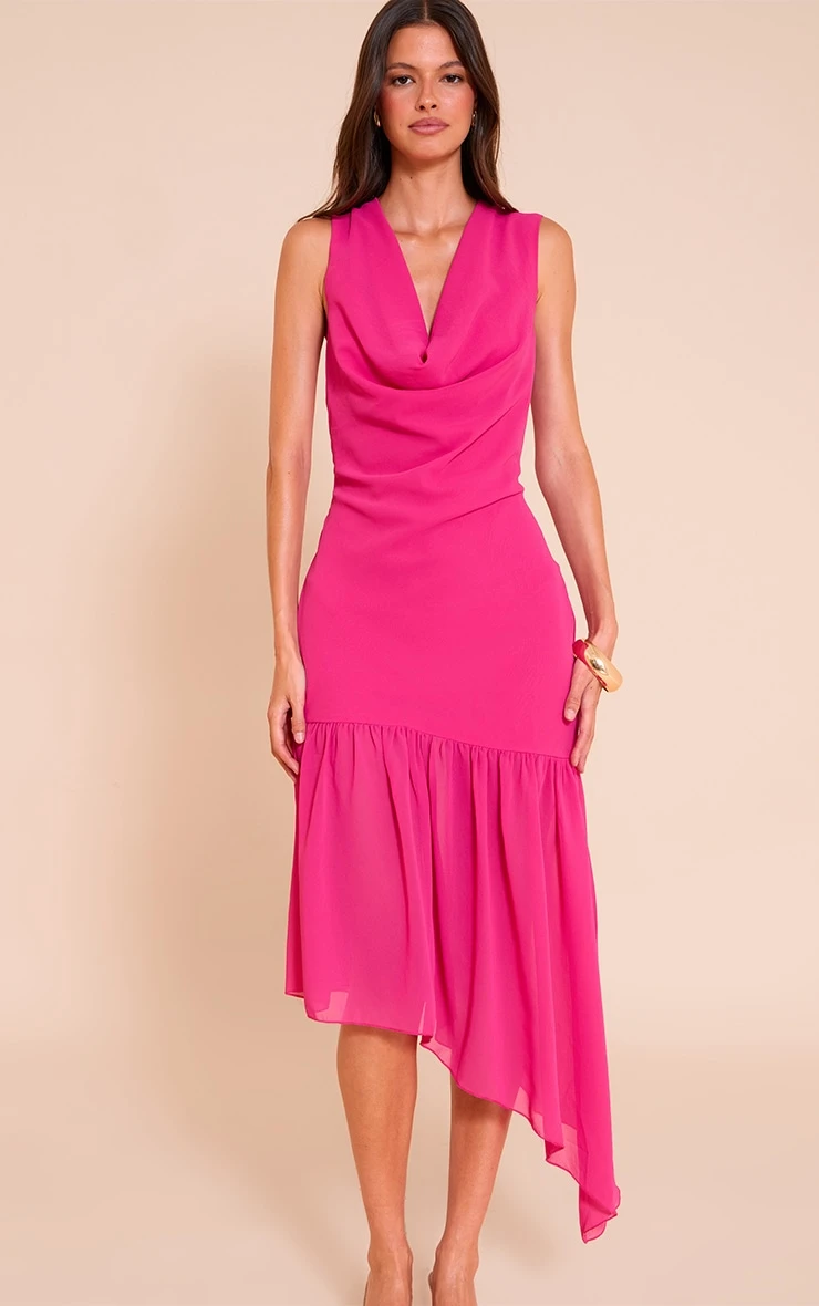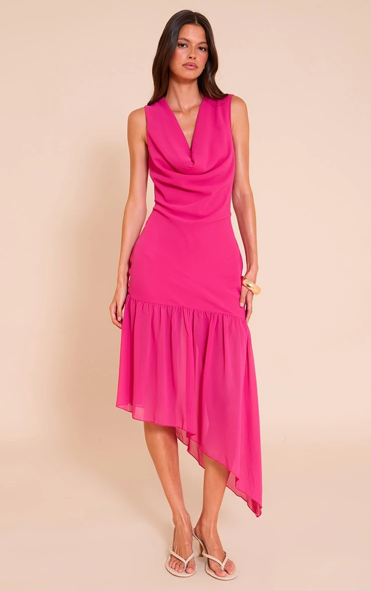 Make a bold impression in the fuschia chiffon drape detail asymmetric midaxi dress. The vibrant hue paired with fluid chiffon and an asymmetric silhouette makes this a standout choice. Perfect for weddings or sophisticated summer events, this design brings both flair and femininity. Accessorise with neutral heels and gold jewelry for a striking finish.