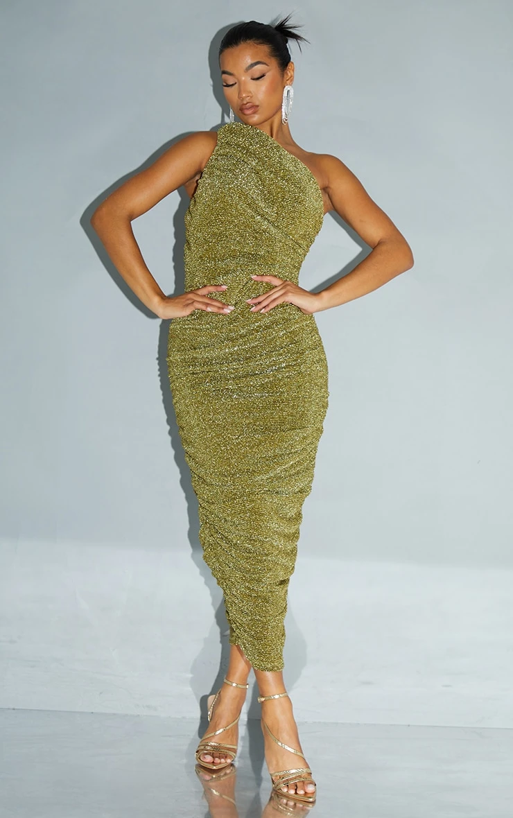 Gleaming with a sophisticated edge, this midi dress makes a considered entrance. The gold glitter plissé fabric catches the light with every move, while the strategic ruching flatters the silhouette. A single shoulder neckline adds an asymmetric point of interest. Elevate the look with a sculptural clutch from our accessories collection for an evening statement.