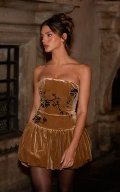 Golden olive velvet, reimagined. This season, the eternally chic fabric finds a new dimension in this embroidered detail puffball dress. The rich velvet catches the light, enhanced by intricate embroidery that elevates the silhouette. Note the construction: the expertly shaped puffball skirt lends a modern structure, allowing for graceful movement. Balance the depth of the golden olive with delicate gold jewelry from our accessories collection for a considered after-dark statement.