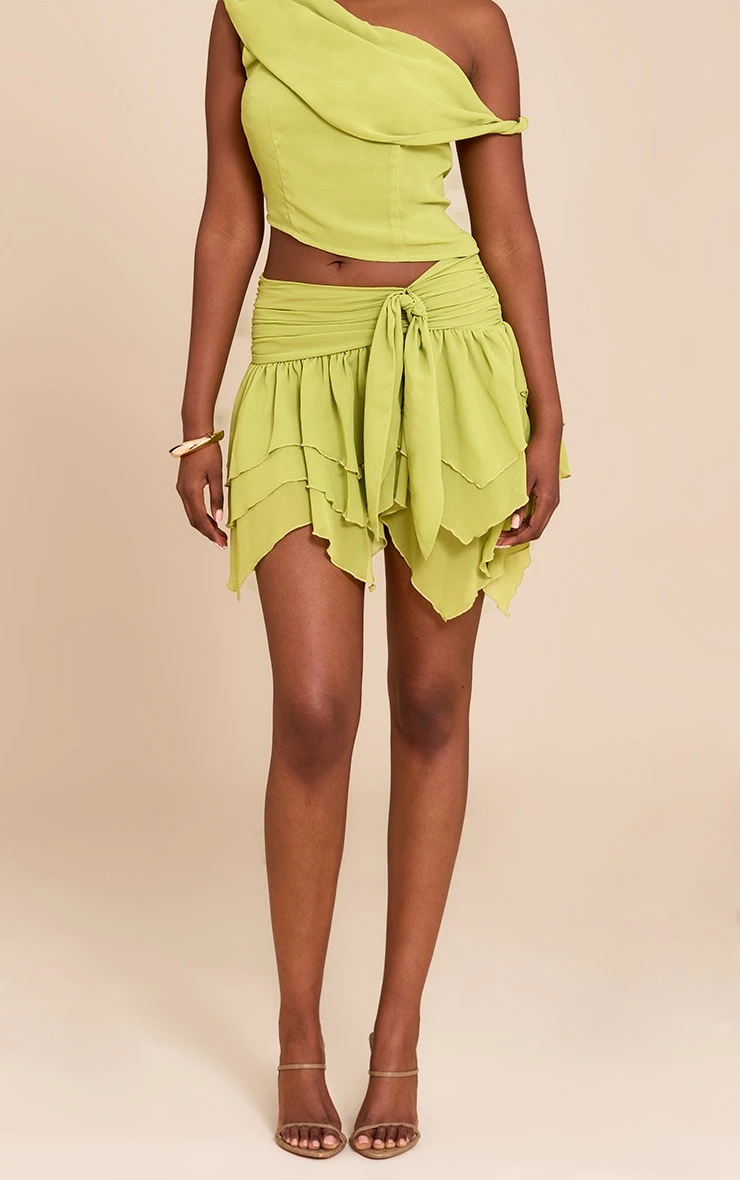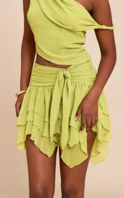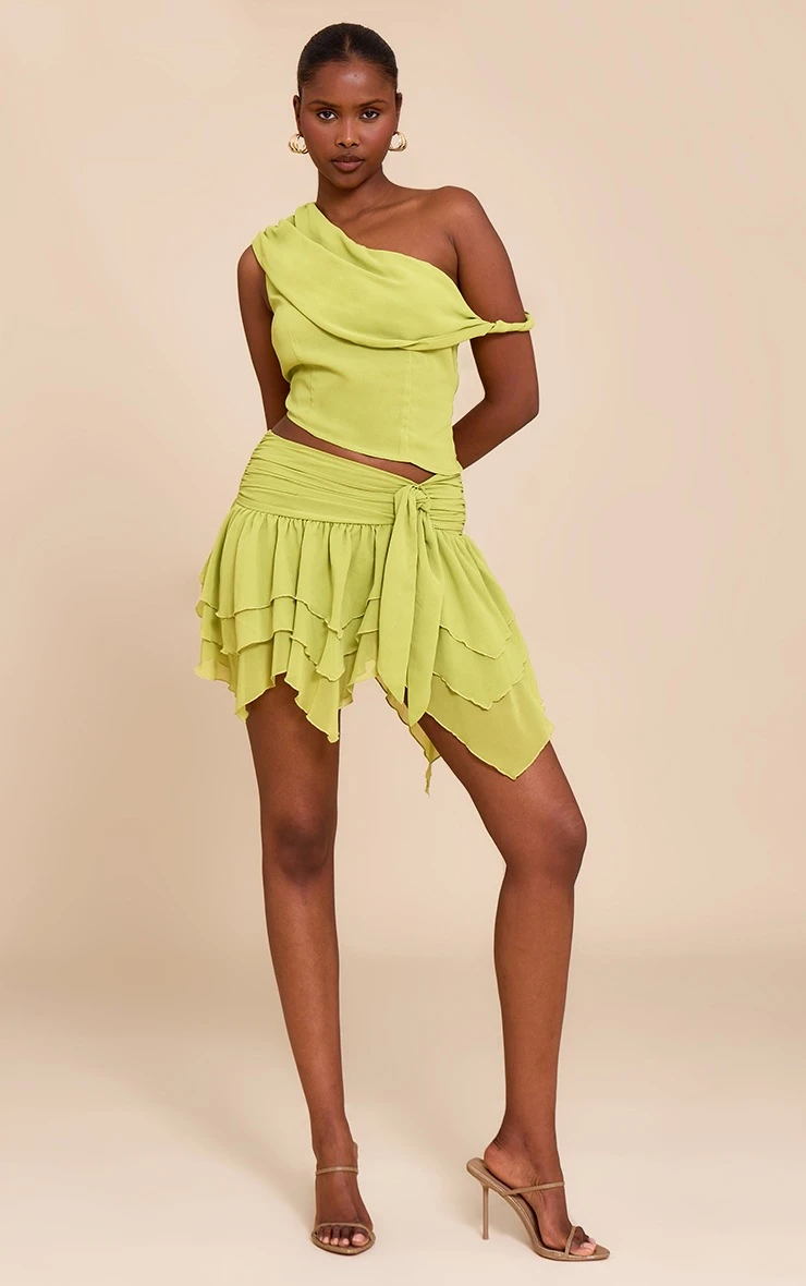 Get ready to turn heads in this green chiffon frill detail mini skirt. Brought to you in a standout green hue material, this skirt has a knit detail at the waist and a ruffled skirt design. For an elevated finish, add the matching top, strappy stiletto heels and miniature gold earrings for a look we know you’ll love.