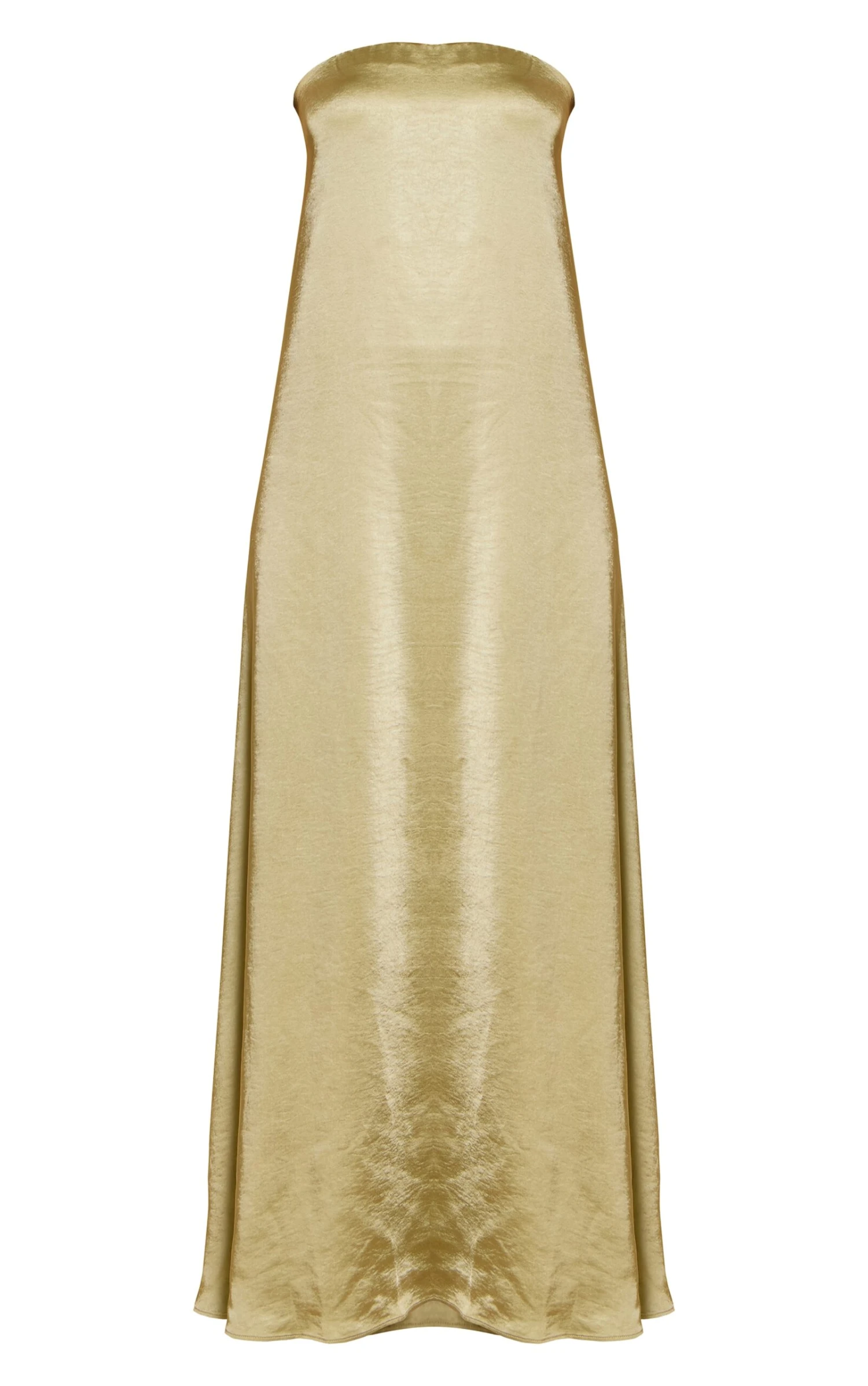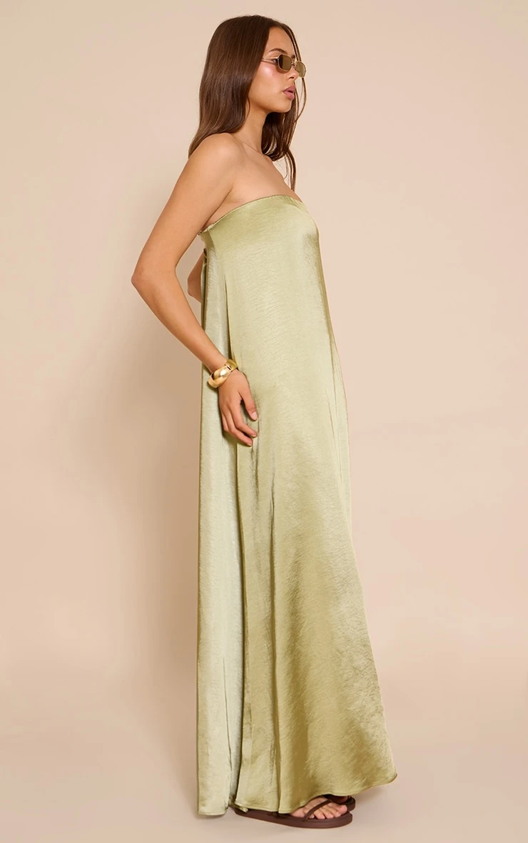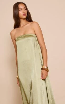 Step out in style with the green textured satin bandeau column dress. Featuring a rich textured finish and sleek column cut, this strapless design offers structure with elegance. Style with gold hoops and simple heels to complete the look.