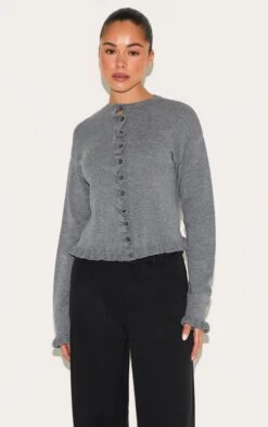 Made from a versatile grey knit material with a chic ruffle detail. Team this grey knit ruffle detail cardigan with a pair of wide leg pants and gold hoops for a chic finish.