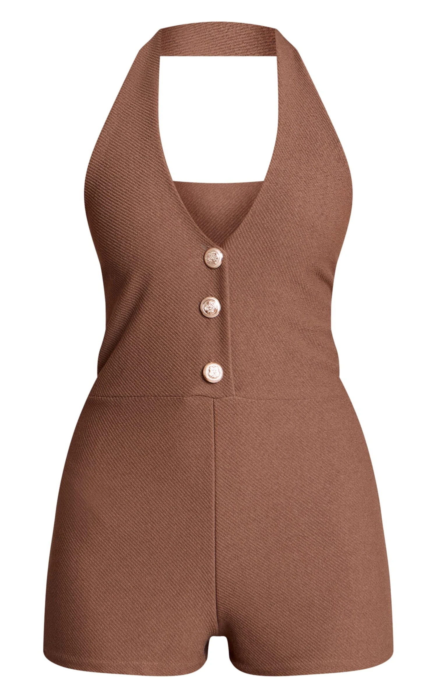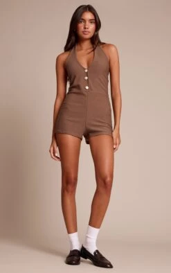 Keep it modern in the khaki value detail unitard. Made from a khaki stretch material, it features value detailing, a sleeveless cut, and a fitted unitard silhouette. Style with slip on mule heels and a clutch bag for an effortlessly chic finish.