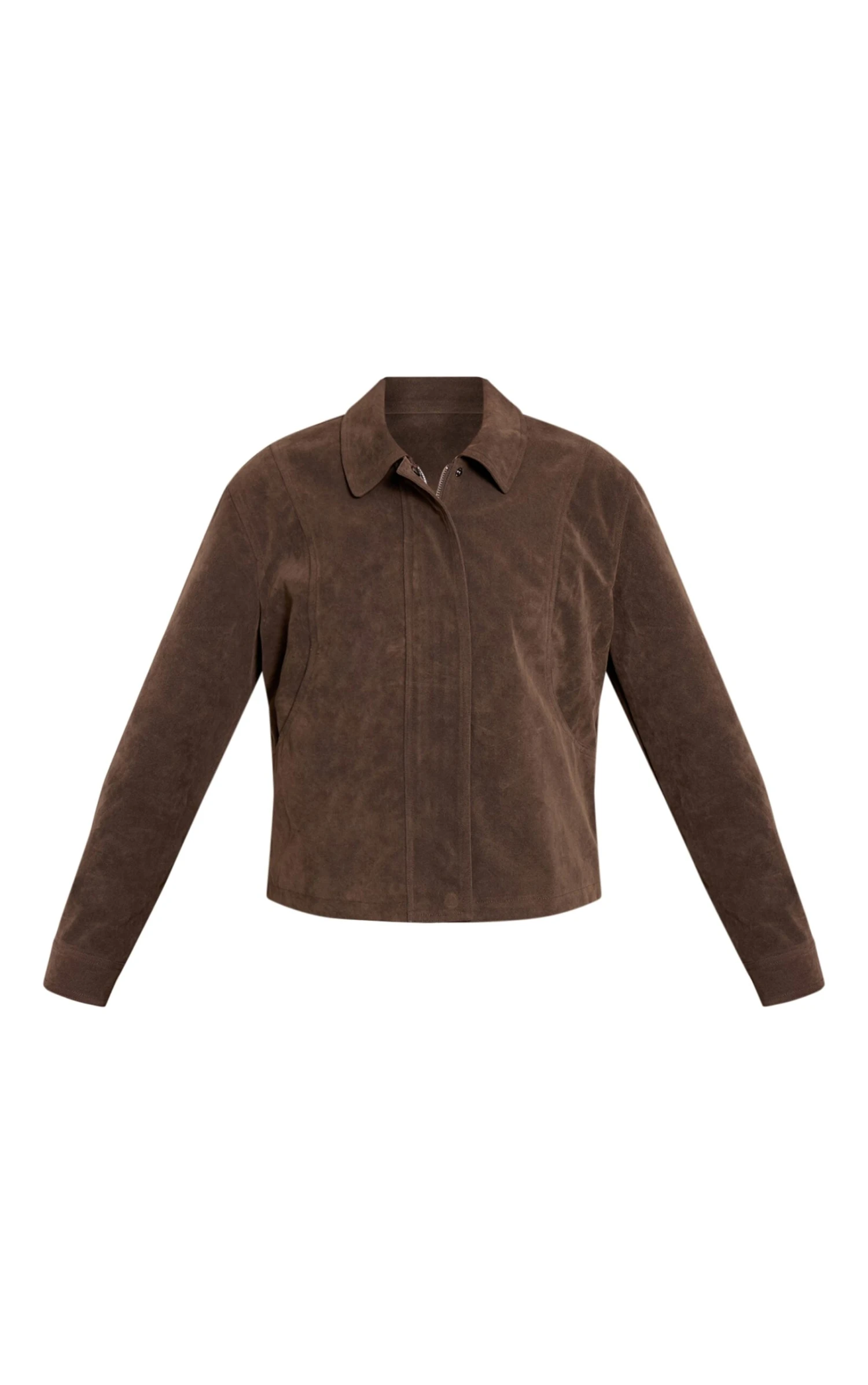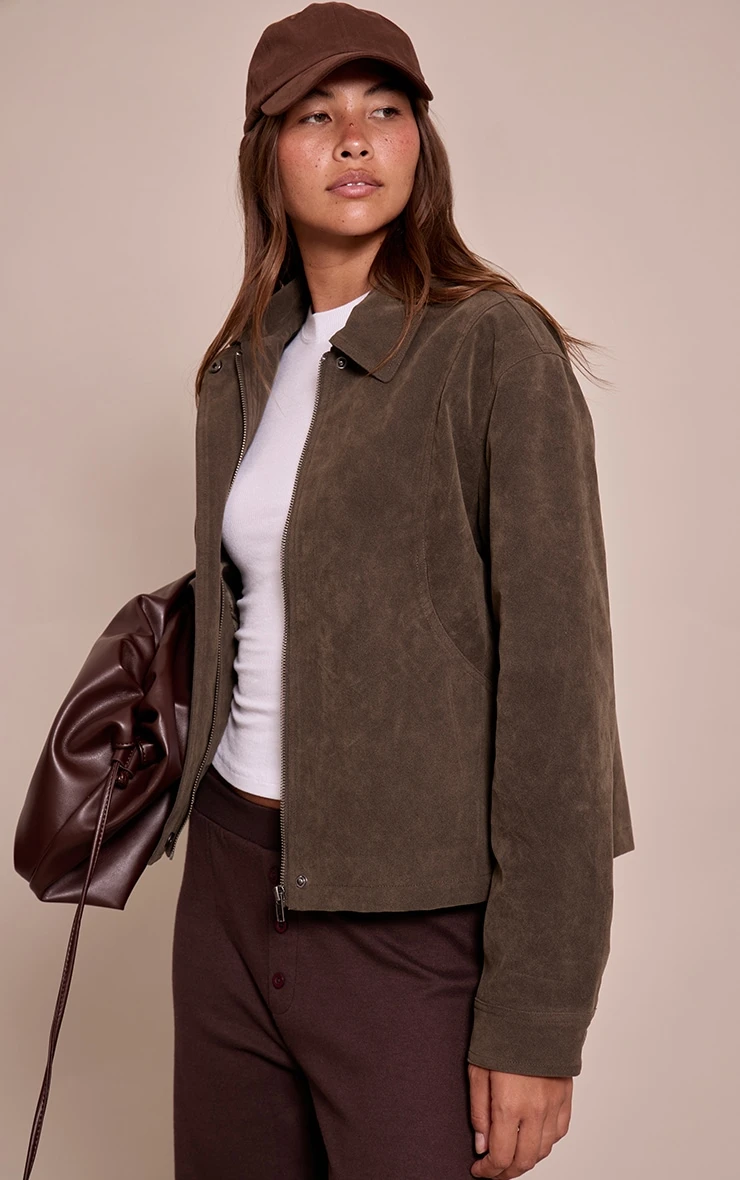 Unlock modern utility with the khaki faux suede concealed placket bomber jacket. This outerwear staple cultivates a relaxed silhouette, perfect for layering. It features a sharp collar and a sleek zip fastening, designed for seamless wear. Pair this versatile bomber over a clean white top and wide-leg pants for a confident day look that means business.