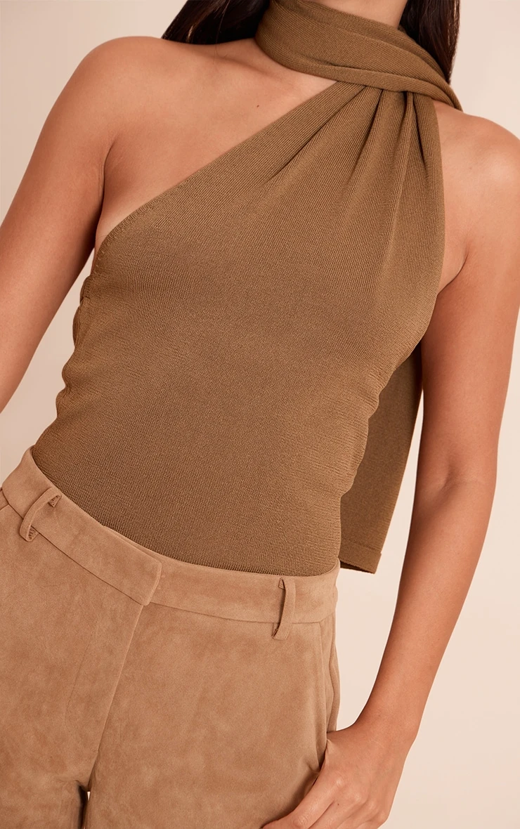 Refine your everyday look with the khaki scarf neck detail sleeveless knitted top. Designed in a soft khaki knit, it combines a sleeveless silhouette with a scarf neck finish for effortless style. Wear with tailored shorts and a shoulder bag for a chic office-to-evening fit.