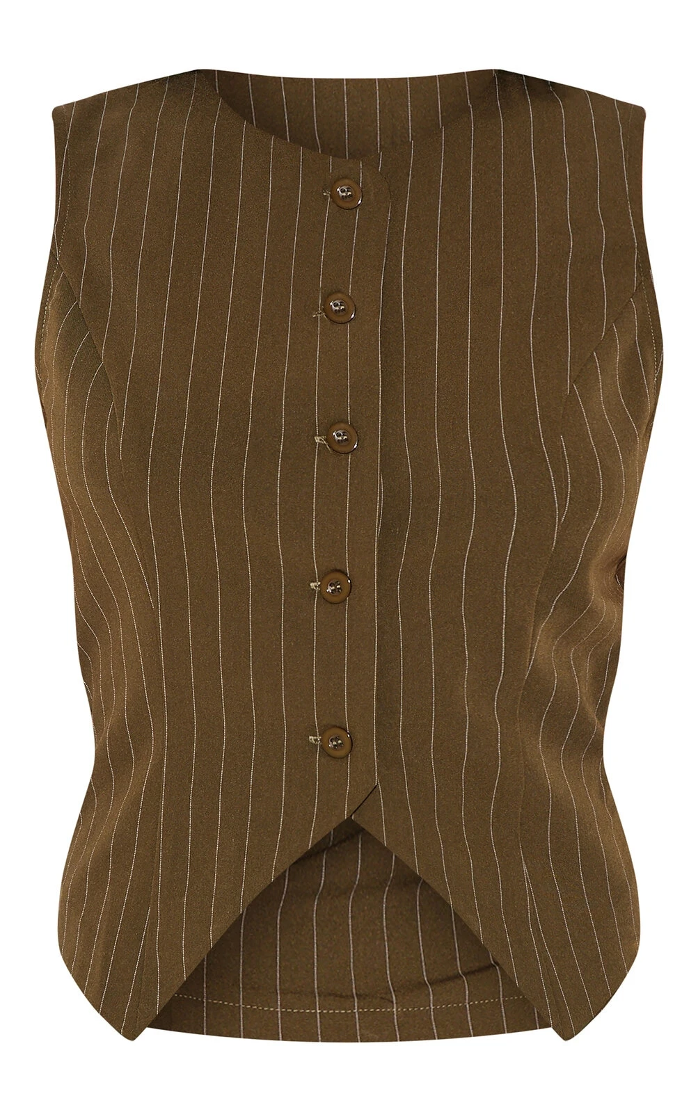 Reimagine your weekday wardrobe with this khaki tailored vest. Cut from a woven pinstripe, the cinched waist flatters the silhouette whilst retaining a certain borrowed-from-the-boys charm. The value-through fastening allows for versatile styling; wear it solo or layered over a fine knit. For a considered daytime ensemble, style it with tailored pants from our bottoms category for a quietly confident statement.