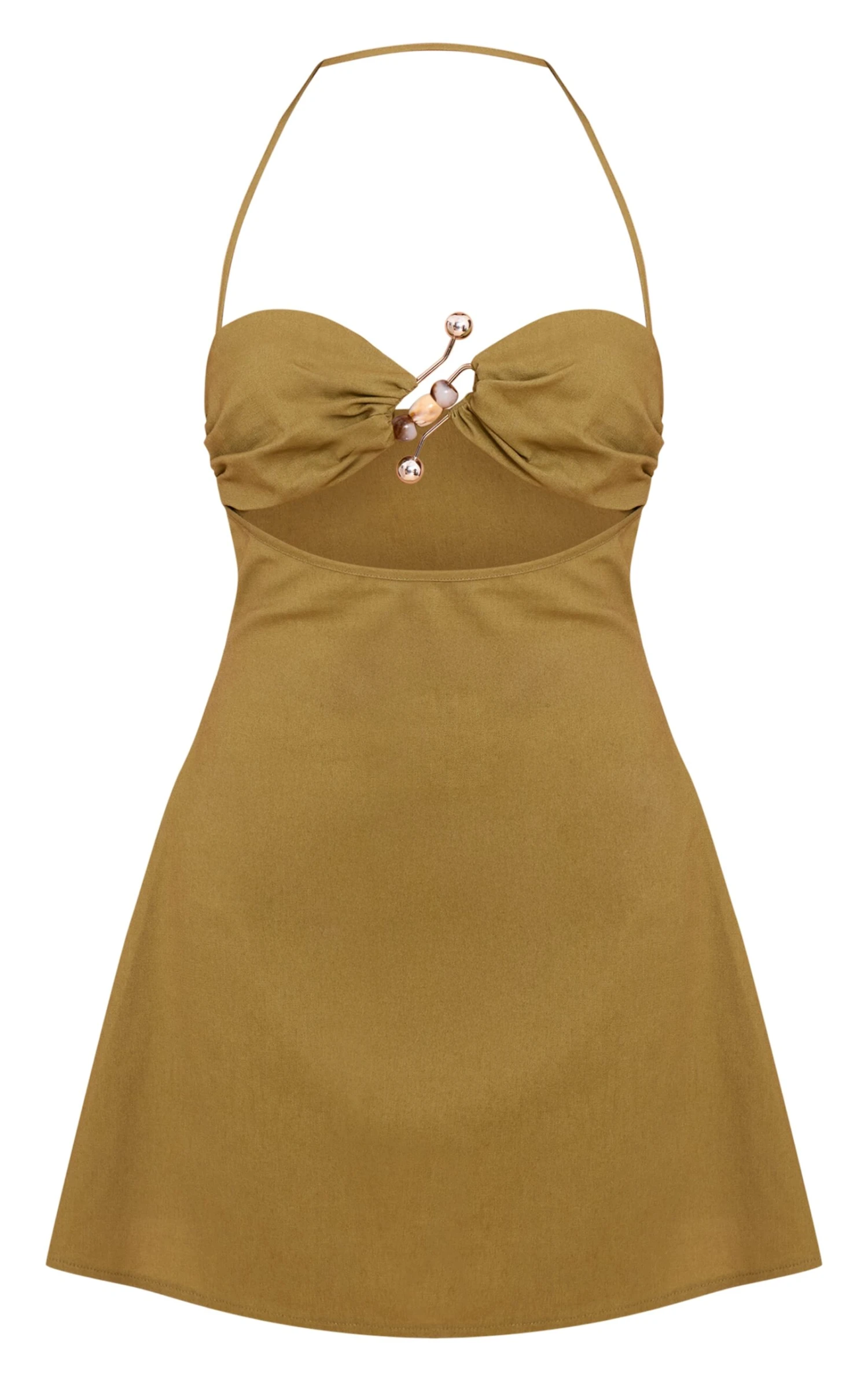 Catch every eye in a dress designed to stand out. The khaki trim detail shift dress offers a distinctive take on evening wear, featuring a flattering sweetheart neckline anchored by delicate halterneck straps. Its unique central trim detail, adorned with organic-look beads and silver-toned hardware, creates an alluring cut-out at the midriff, flowing into a sleek mini-length shift silhouette. Elevate this confident piece with statement heeled mules and a compact clutch for an unforgettable entrance.