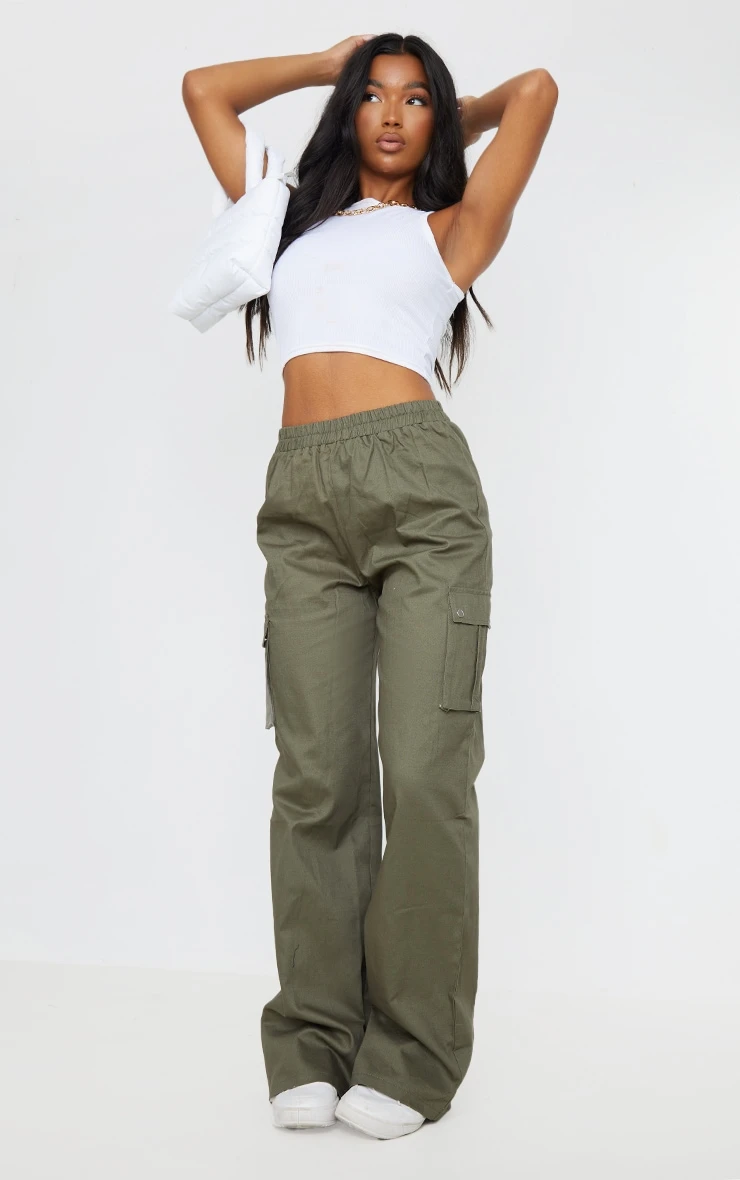 Cargo pants are a must-have this season and we love this pair. Featuring a khaki material with a wide-leg fit and pocket detailing. Style them with a cropped hoodie, chunky boots, and minimal accessories to finish the look.