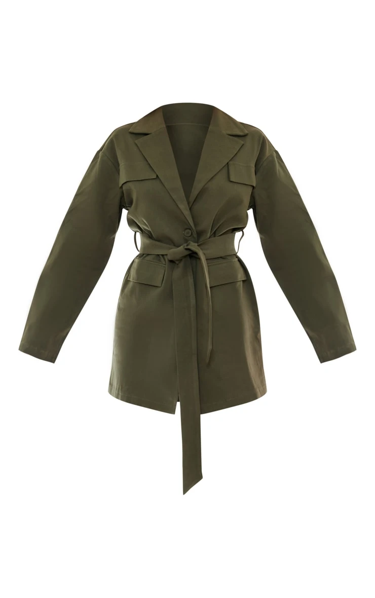 The blazer dress, reimagined. This woven khaki iteration offers a masterclass in contemporary tailoring, blending sharp lines with utilitarian detailing. Note the considered value placement and defining belt, cinching the silhouette for a controlled yet effortless shape. Crafted from a durable woven fabric, this piece transcends fleeting trends, promising enduring appeal. Elevate the look with a sculptural gold cuff from our jewelry collection; a confident finishing touch.