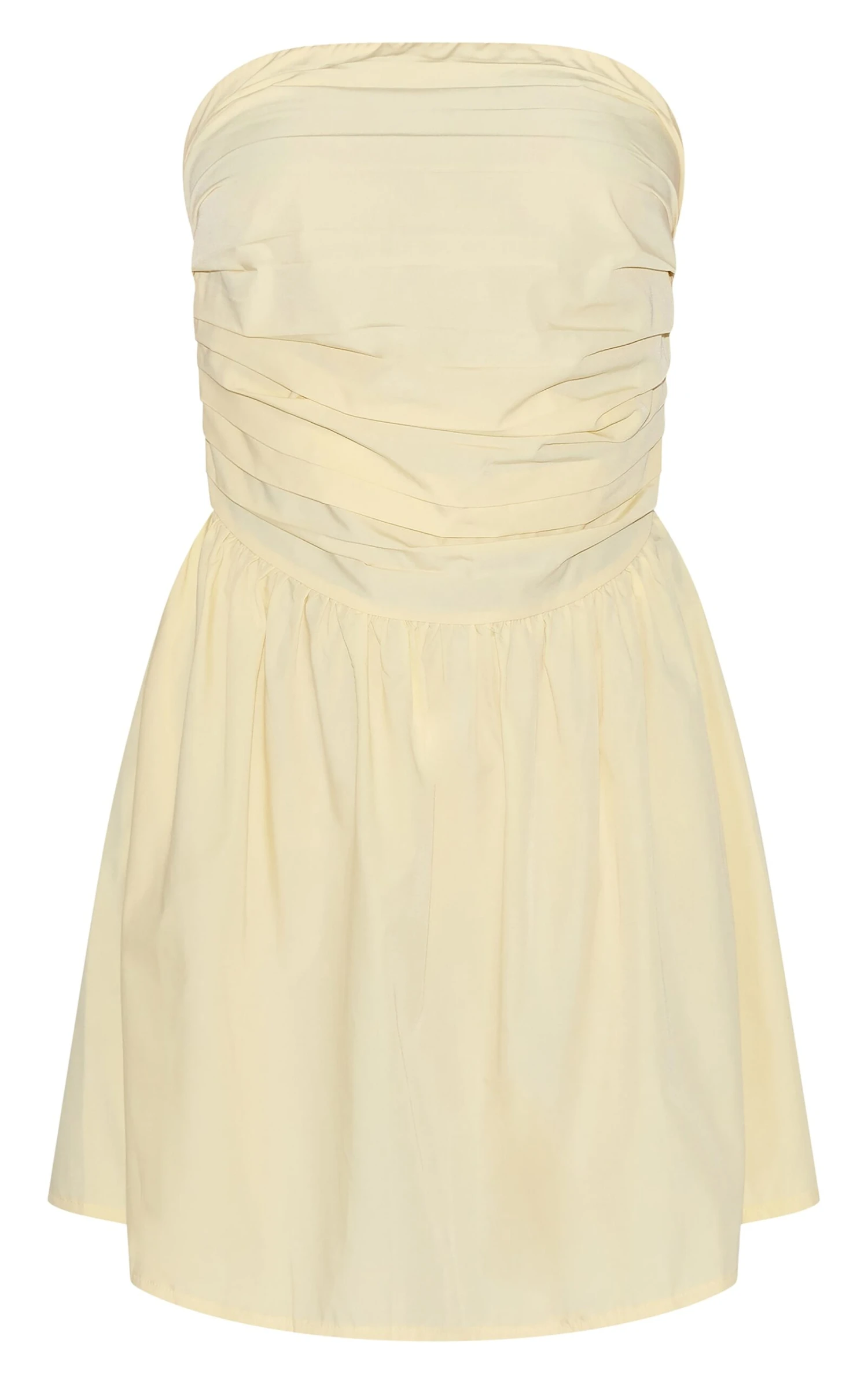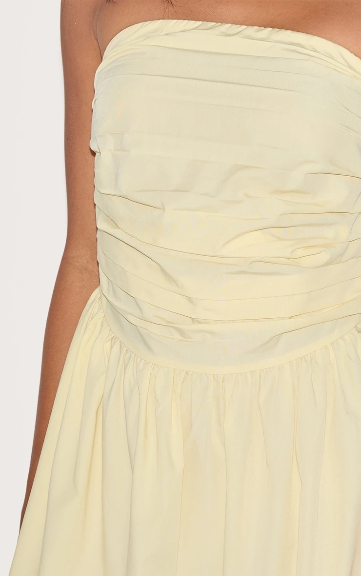 Say hello to your new season staple with this lemon bandeau ruched detail shift dress. Crafted with care from pale yellow material, this dress has a classic bandeau neckline with ruffle detailing. For a finish that is bound to turn heads, style this dress with simplistic gold jewelry and your favorite white stiletto heels.