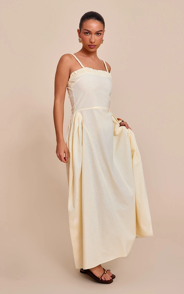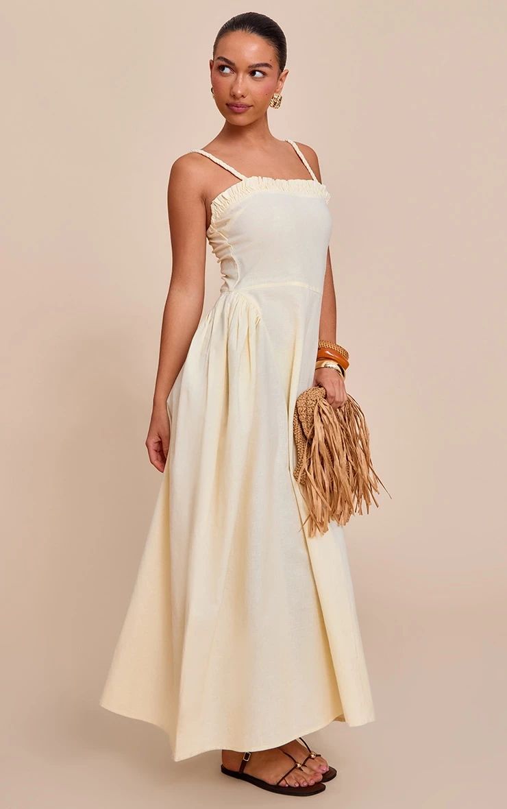 Master effortless day styling with an essential piece that speaks volumes. The lemon braided v waist midaxi dress perfects your warm-weather wardrobe with its distinctive strapless design, featuring a delicate shirred ruffle neckline and unique braided straps. An artful V-waist detail creates a defined silhouette, leading to a gracefully flared midaxi skirt. Elevate your look with simple flat sandals and a statement ear cuff, or layer with a lightweight trench for chic transitional styling, solidifying a polished, self-assured ensemble.