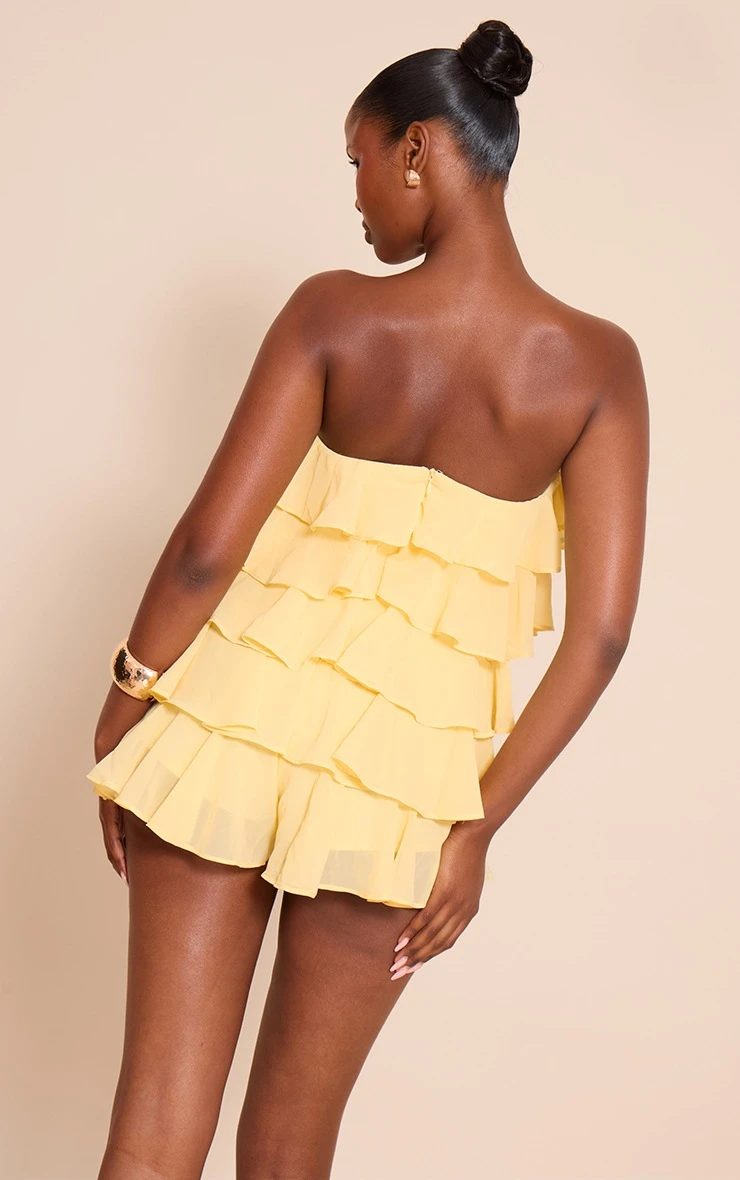Inject vibrant energy into your evening wear with the lemon chiffon bandeau frill romper. A bold bandeau neckline sets a confident tone, flowing into tiered frills that create a dynamic silhouette, falling to a contemporary short length. Team this statement romper with sharp pointed heels and a minimalist clutch bag for an undeniable presence, or layer a crisp tailored jacket over for an added edge that ensures all eyes are on you.