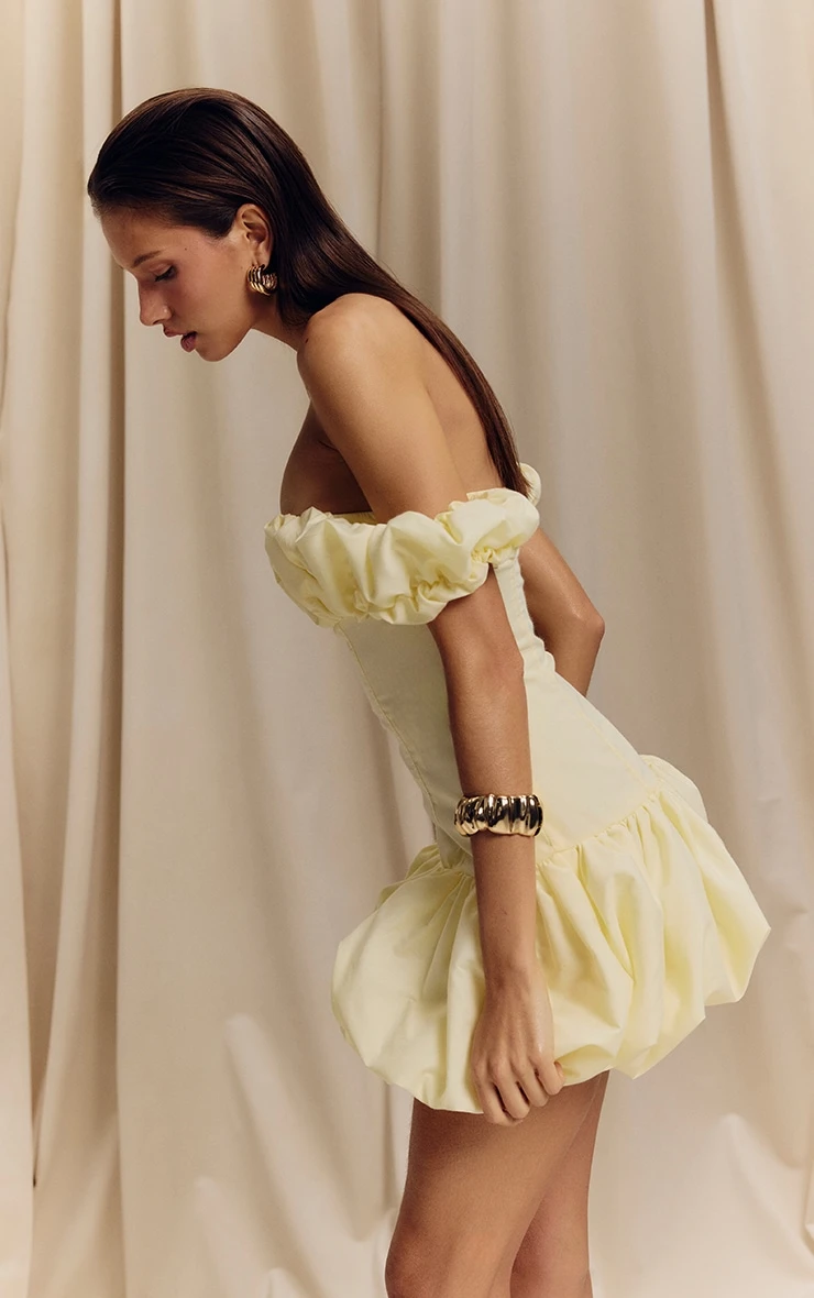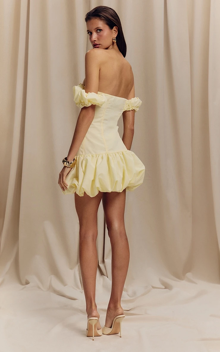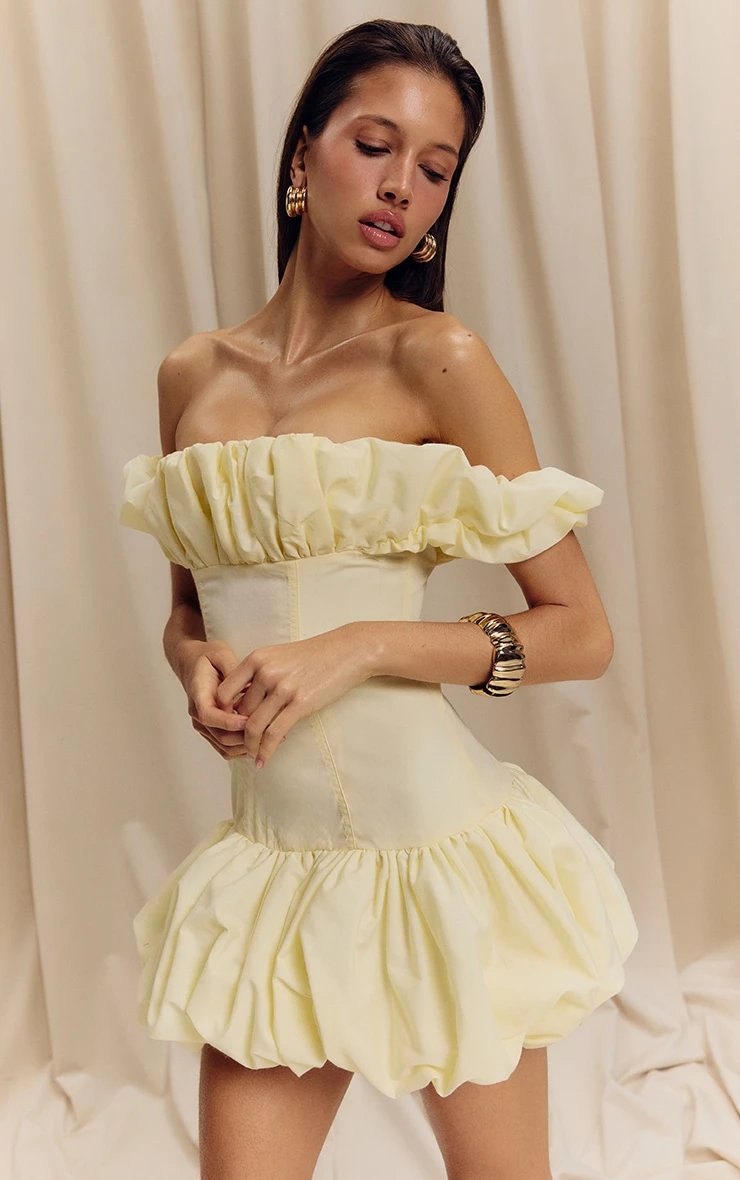 Built for versatility, this dress is brought to you in lemon hue material with a chic bardot puff neckline, puff hem skirt and a flattering bodycon fit. Pair this lemon ruched bardot puff hem bodycon dress with your go-to pair of pointed toe court heels, statement sunglasses and elegant jewelry for a chic Summer look we are loving.