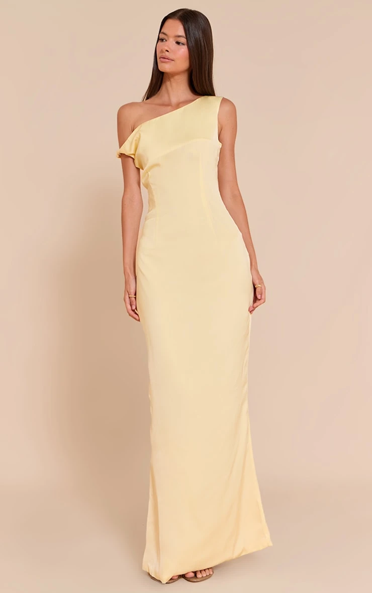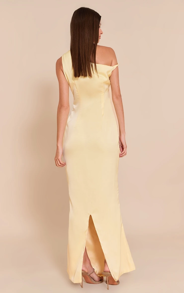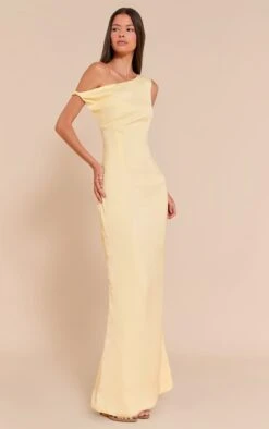 Introducing the lemon satin asymmetric bardot twist maxi dress. Crafted from lustrous satin, this dress features an asymmetric hem and bardot neckline with a twist detail for an elegant silhouette. Pair with statement earrings and strappy heels to complete the look.