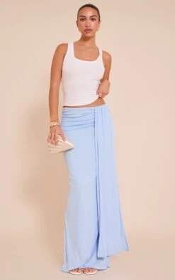 Float through the season in this light blue double layer onion skin drape detail maxi skirt, perfect for soft styling. Brought to you in a light blue onion skin textured fabric with a flowing draped fit and double layer detail, it’s lightweight and elegant. Pair with a matching crop and sandals for an ethereal summer look.