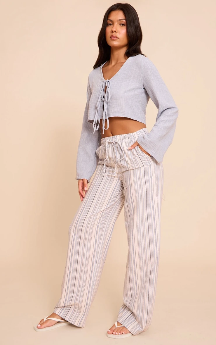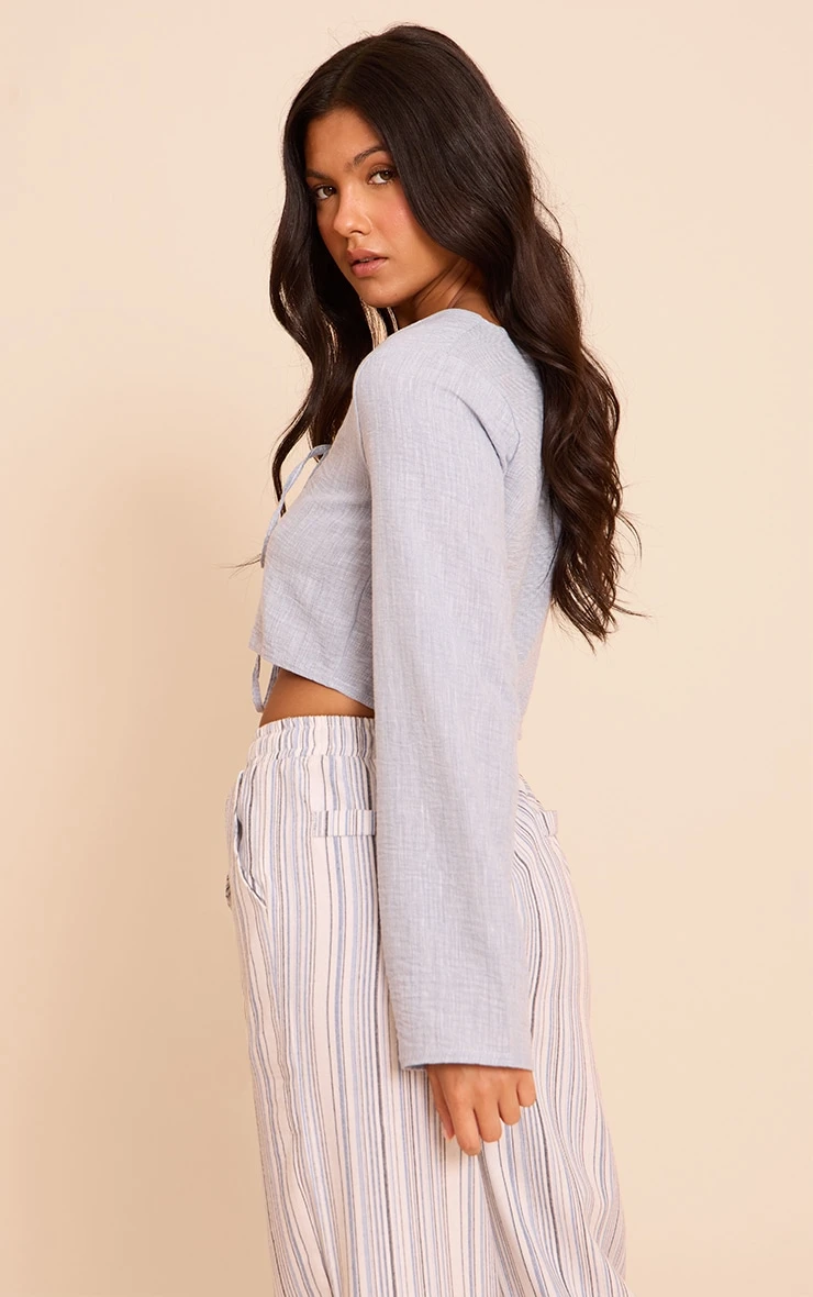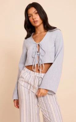 The light blue textured tie front detail blouse offers breezy charm with delicate tie-front shaping. Its airy fabric and scoop neckline make it ideal for warm-weather dressing. Pair with linen pants and wedge espadrilles for resort-ready polish, or tuck into denim shorts and sandals for a relaxed, put-together look.