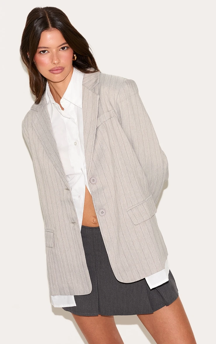 Keep it effortlessly chic in this light grey pinstripe shirt detail blazer. Brought to you in a light grey material with a pinstripe design and a shirt detail, adding a touch of luxe like no other. Team this blazer with your go-to jeans and sneakers for a look we just can’t get enough of.