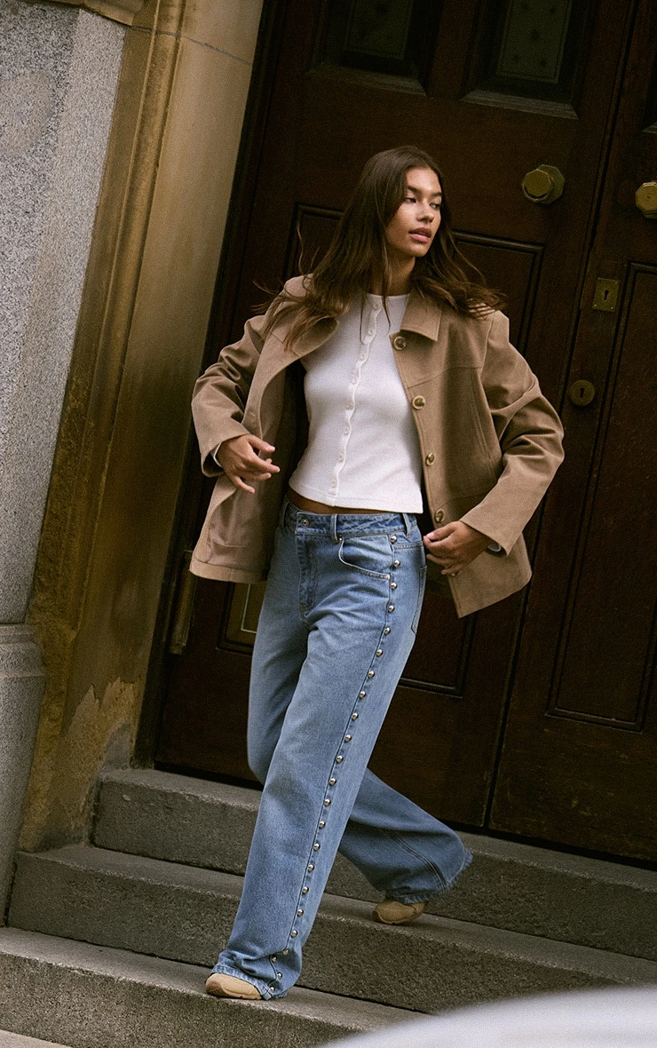 Opt for standout denim with the mid blue studded high waist jeans. Designed in mid blue denim, this pair features a high waist and studded detailing for a bold edge. Style with a cropped shirt and a pair of sneakers for a fashion-forward look.