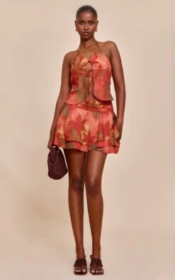 Step into your next evening moment with artful conviction. The multi floral printed ruffle hem mini skirt delivers a distinctive visual impact, featuring an eye-catching pattern and a dynamic tiered hem that moves with undeniable grace. Its mini length ensures a confident profile, perfect for after-dark outings. Pair this vibrant piece with the coordinating halterneck cami top for a complete, knowing ensemble, or wear it with a sleek black bandeau and sharp heeled mules for an effortlessly elevated look ready for any evening occasion.