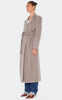 The maxi coat, reimagined. This mushroom herringbone coat elevates your outerwear edit with its refined texture and considered silhouette. The timeless herringbone weave provides a sophisticated visual depth, whilst the self-tie belt allows for a customisable fit, cinching the waist to create a flattering shape. Drape it over wide-leg tailored pants for a confident, contemporary statement.