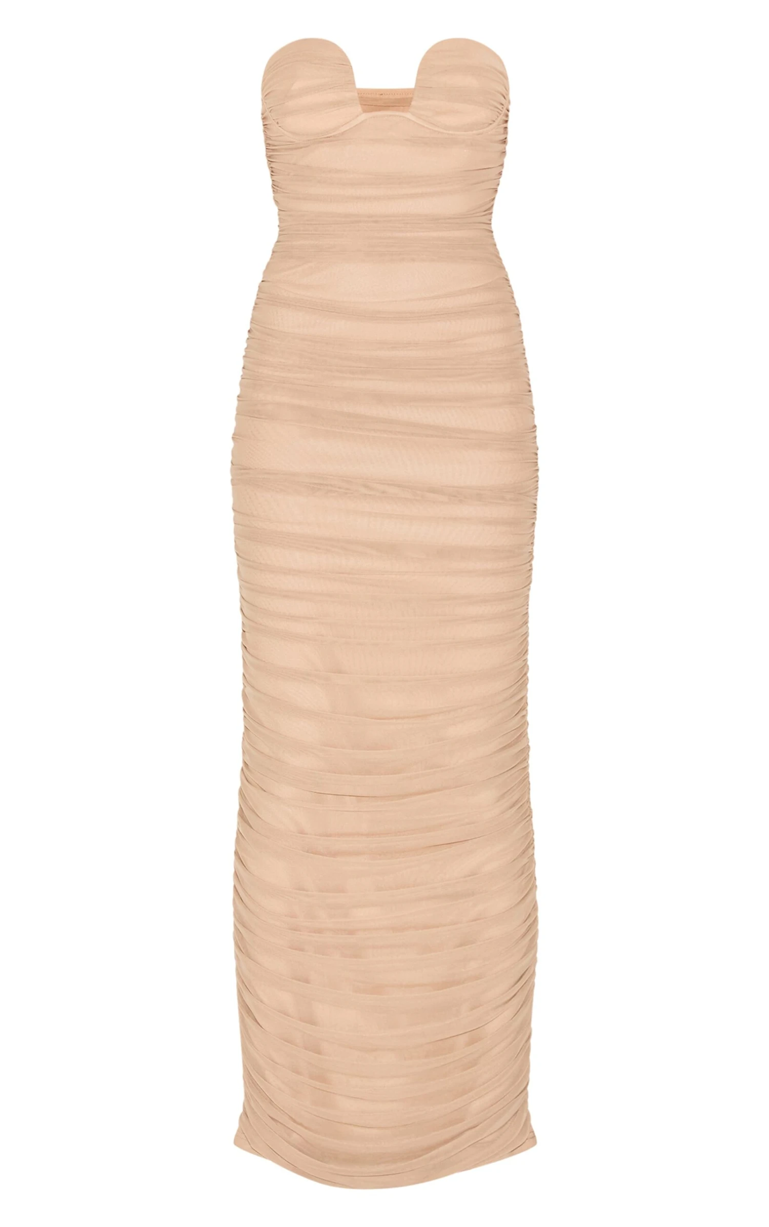 A play on texture shapes your look in the Mushroom Mesh Ruched Bandeau Plunge Maxi Dress. This piece forms the figure with intricate ruching that skims the full maxi length. A bold plunge neckline defines the bandeau cut. Ready for evening, style simply with minimal pointed heels and a structured clutch. Define your evening presence.