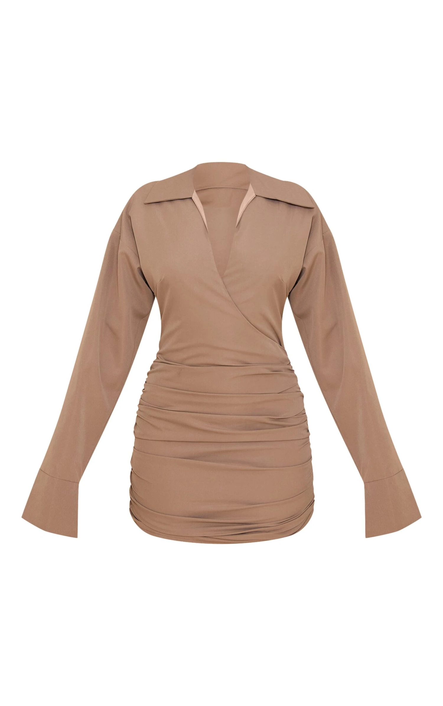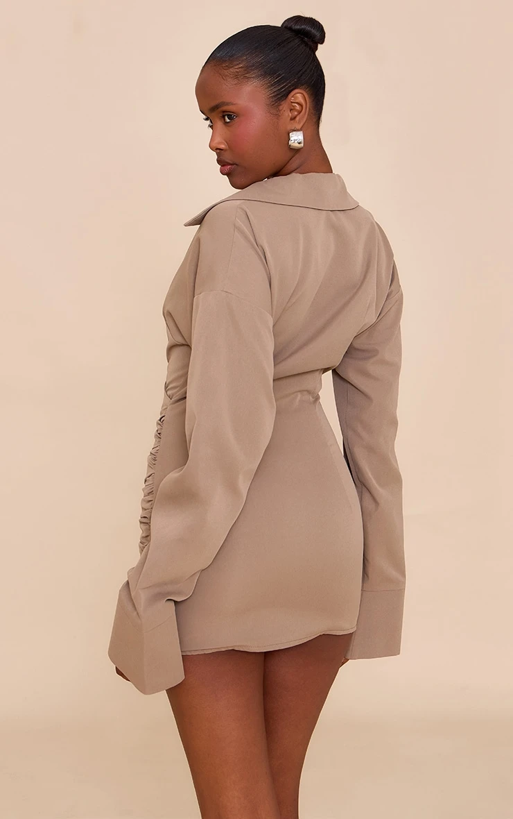 Step out knowing you mean business after dark in the mushroom plunge deep cuff shirt dress. This piece defines sophisticated evening dressing with its sharp shirt collar and confident deep plunge neckline. An artful wrap front leads into statement deep cuffs on long sleeves, while the ruched mini skirt detail creates a dynamic shape. A subtle side zip ensures a smooth fit. Pair this knowing style with pointed heeled mules and bold earrings for an effortless look that commands attention.