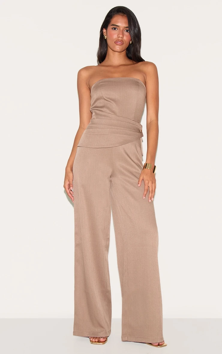 Tap into your chic side in this mushroom woven bandeau tie detail jumpsuit. Brought to you in a mushroom woven bandeau tie detail jumpsuit. Brought to you in a mushroom woven material with a bandeau fit and a flattering tie detail. Team this jumpsuit with a pair of heels and your go-to accessories to level up your outfit.