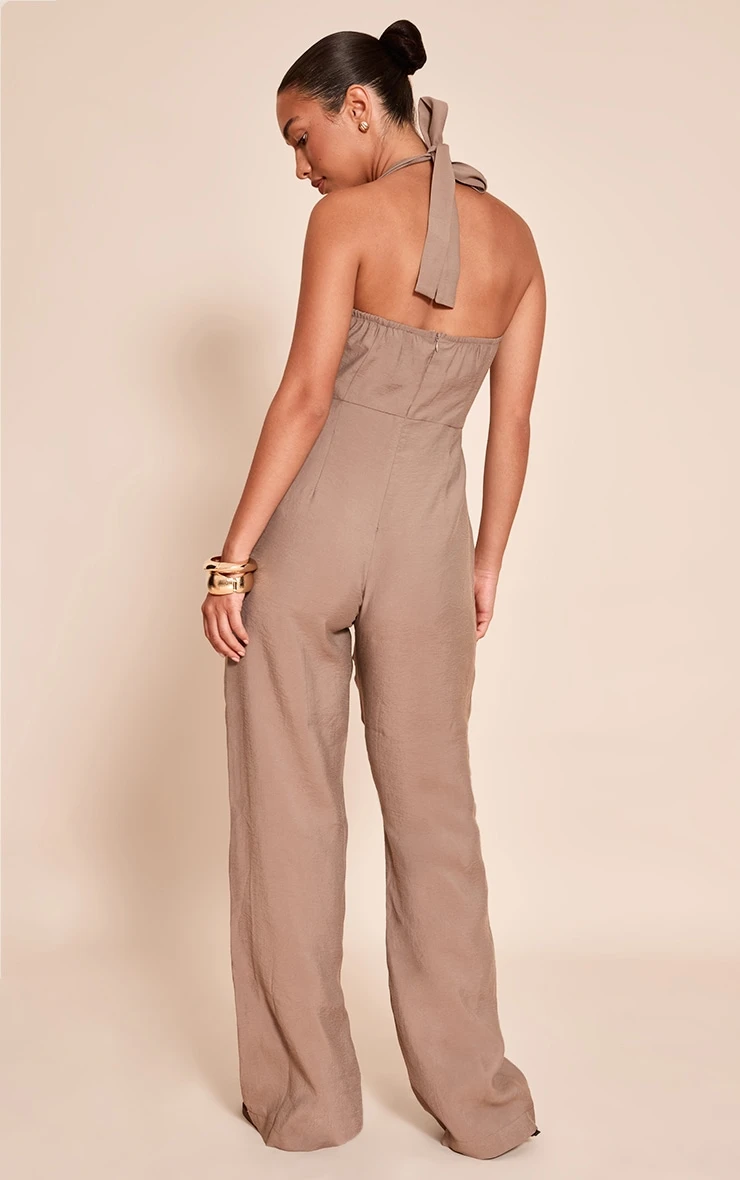 Own your aesthetic in this mushroom woven textured halterneck jumpsuit. Crafted from mushroom hue material, this jumpsuit has a halter neckline and wide leg fit. Team it with nude strappy sandals and your favorite gold jewelry.