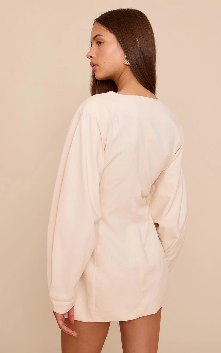 Command attention with minimal effort in the natural woven balloon sleeve collarless blazer dress, a sharp take on a wardrobe staple. This essential piece boasts a contemporary collarless V-neckline, while the structural balloon sleeves add a dramatic edge. A clean-lined hidden front fastening and subtle welt pockets complete the streamlined silhouette. Team this natural hue with chunky sneakers for a casual day look, or elevate it with ankle boots and a structured tote for an elevated weekend vibe.